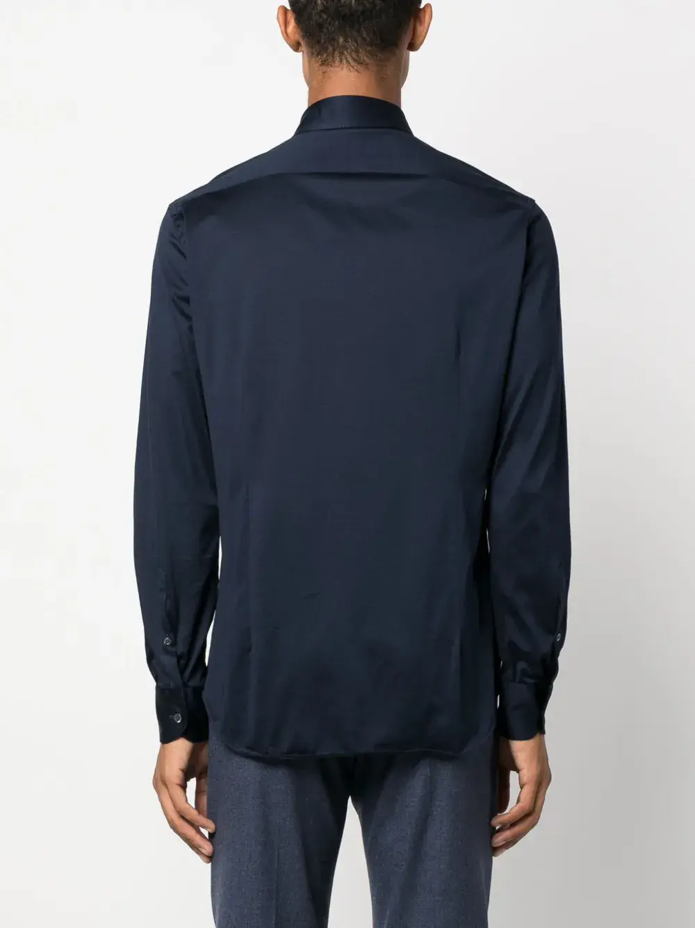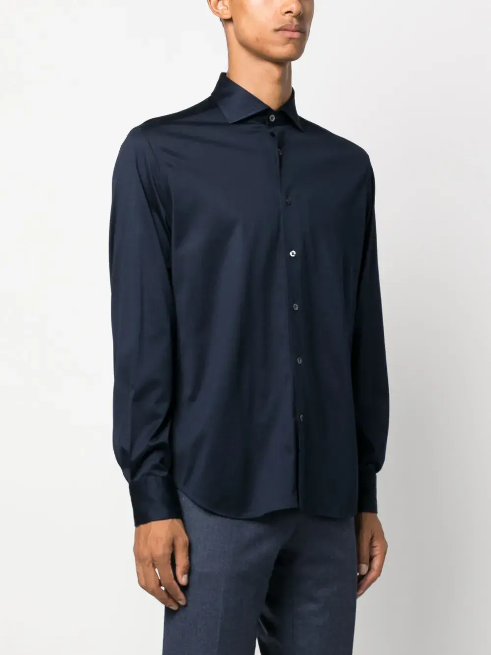 Темно-синий, хлопок, классический воротник, застежка на пуговицах спереди, длинные рукава, манжеты на пуговицах и закругленный подол.