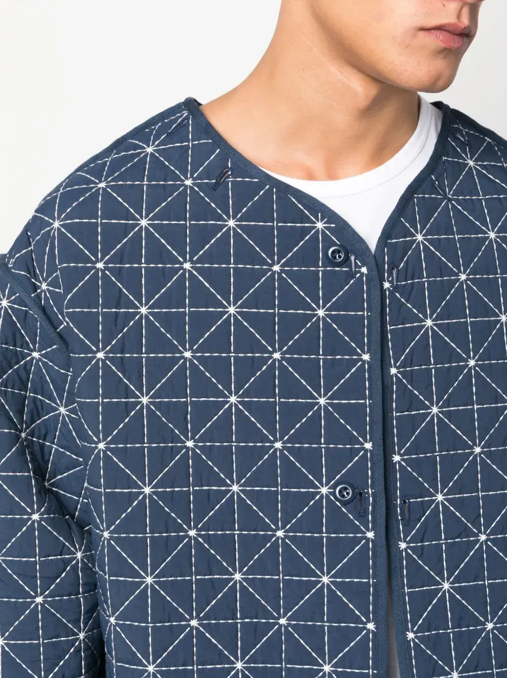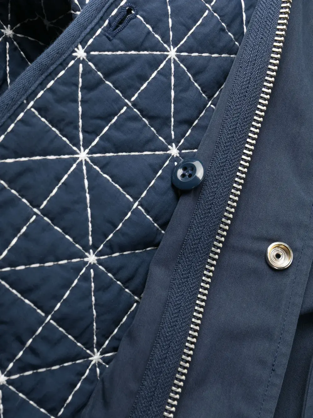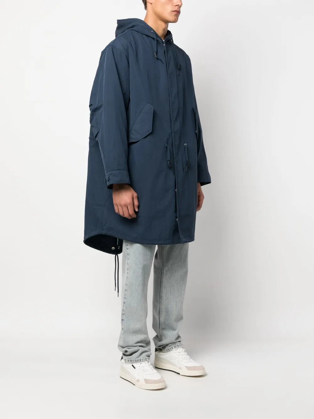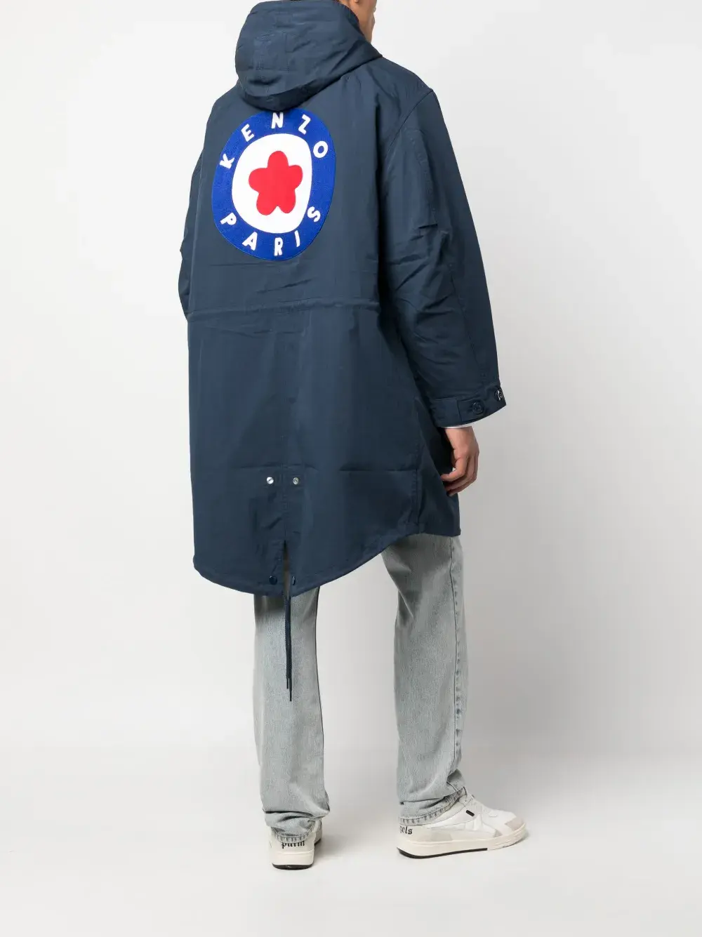 Темно-синий, принт с логотипом сзади, затягивающийся на шнурок капюшон, потайная застежка спереди, кулиска на талии, длинные рукава и два передних кармана с клапанами.