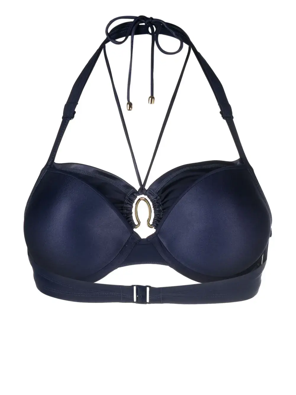 Подробнее о товаре: • темно-синий • смесовый переработанный нейлон • эластичный материал • чашки с эффектом пуш-ап • балконет • завязки вокруг шеи • металлические кольца • застежка на зажиме сзади • Пожалуйста, примеряйте купальники и пляжные шорты только поверх собственного белья. • Этот товар как минимум на 50% состоит из переработанных или повторно использованных материалов.