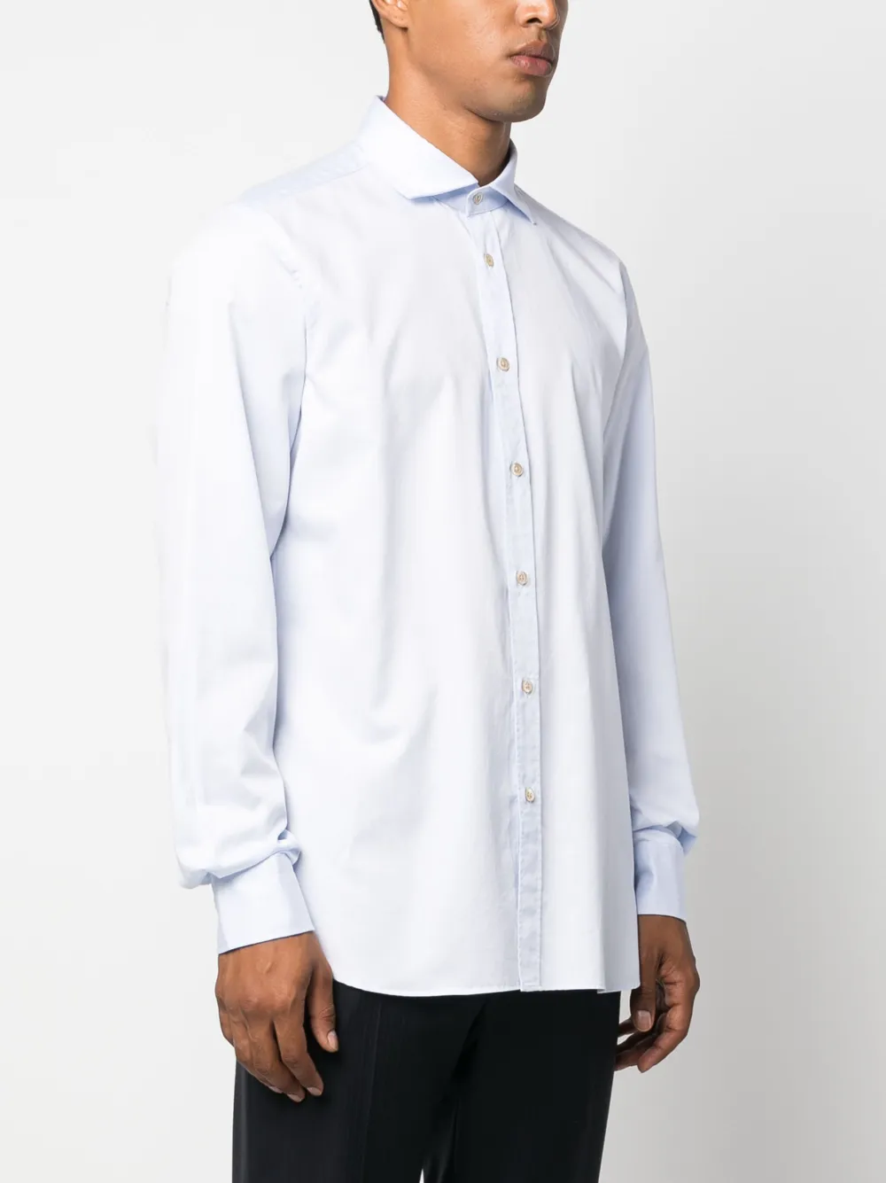 Голубой, хлопок, отложной воротник, застежка на пуговицах спереди, длинные рукава, манжеты на пуговицах и закругленный подол.