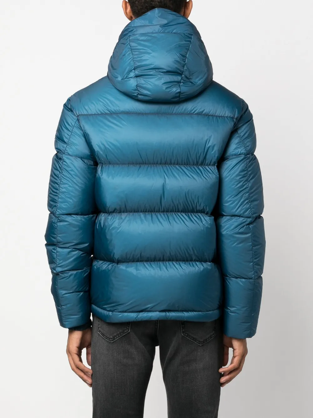 Пыльно-бирюзовый, наполнитель из пуха и перьев, дутый материал, нашивка с логотипом на рукаве, классический капюшон, воротник-стойка, двусторонняя молния спереди, два кармана по бокам, длинные рукава и прямой подол.
