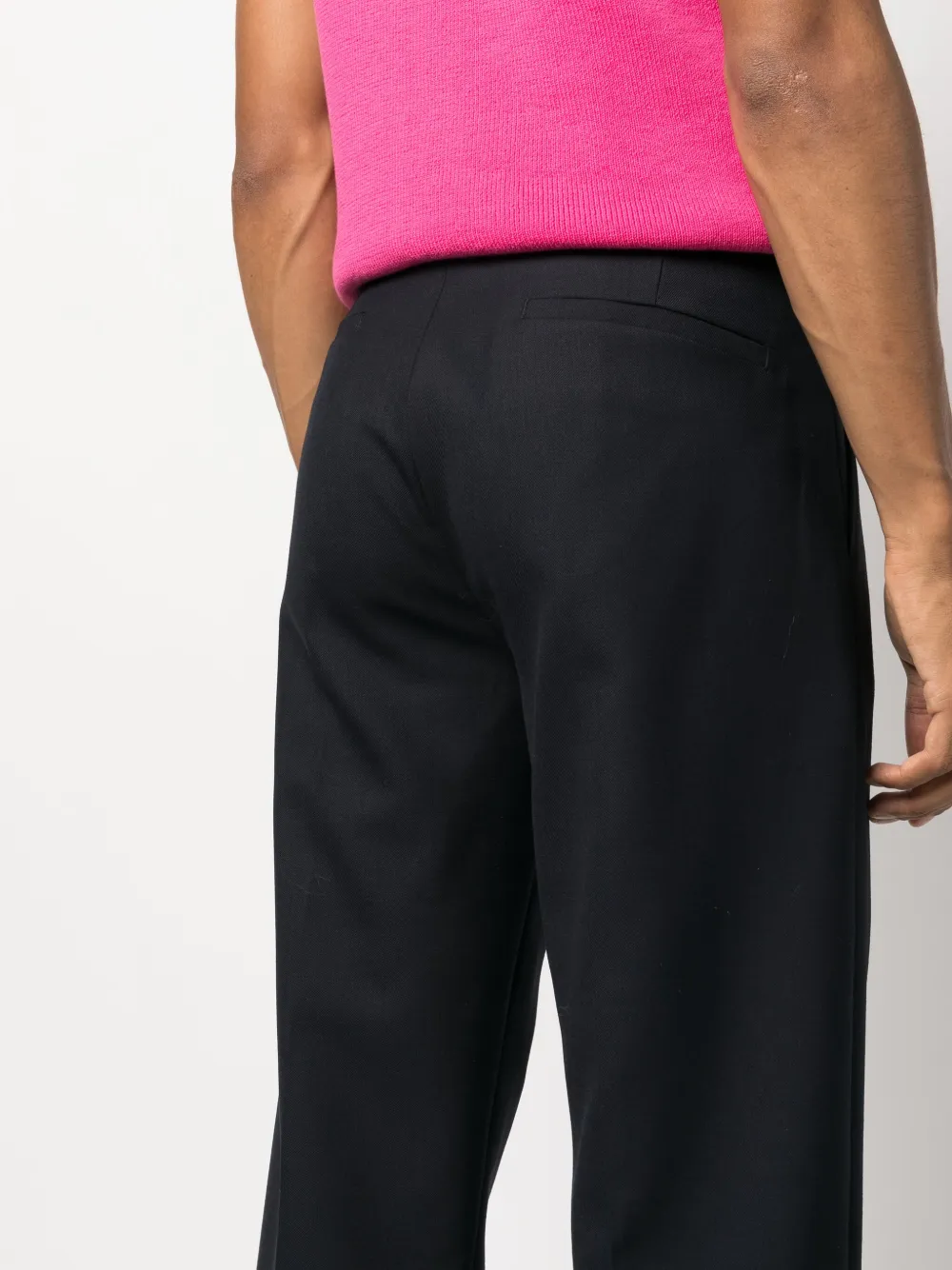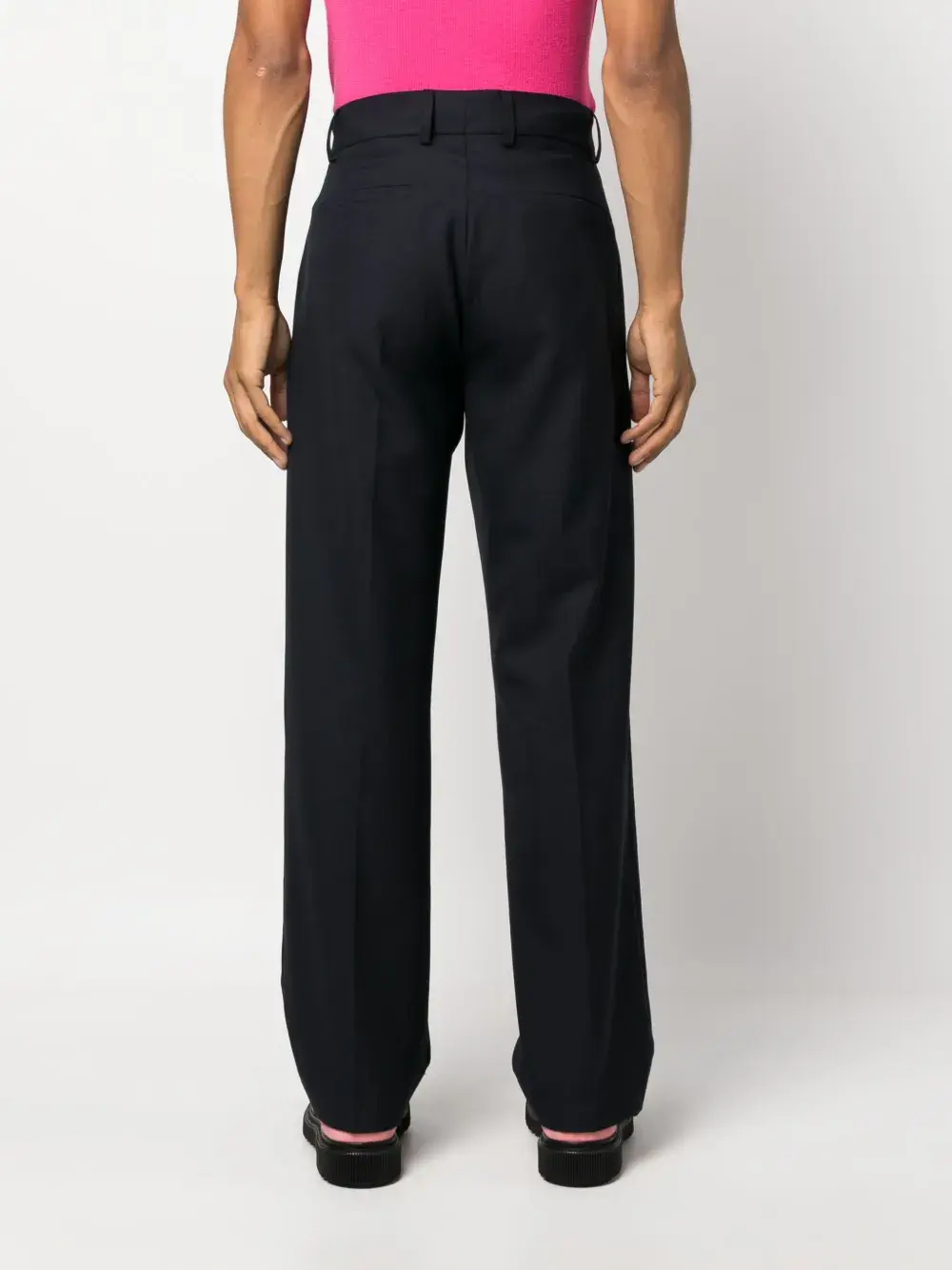Темно-синий, классический крой, стрелки, петли для ремня, смещенная застежка спереди, потайная застежка спереди, прямой крой, два вшитых кармана по бокам и два кармана с листочкой сзади.
