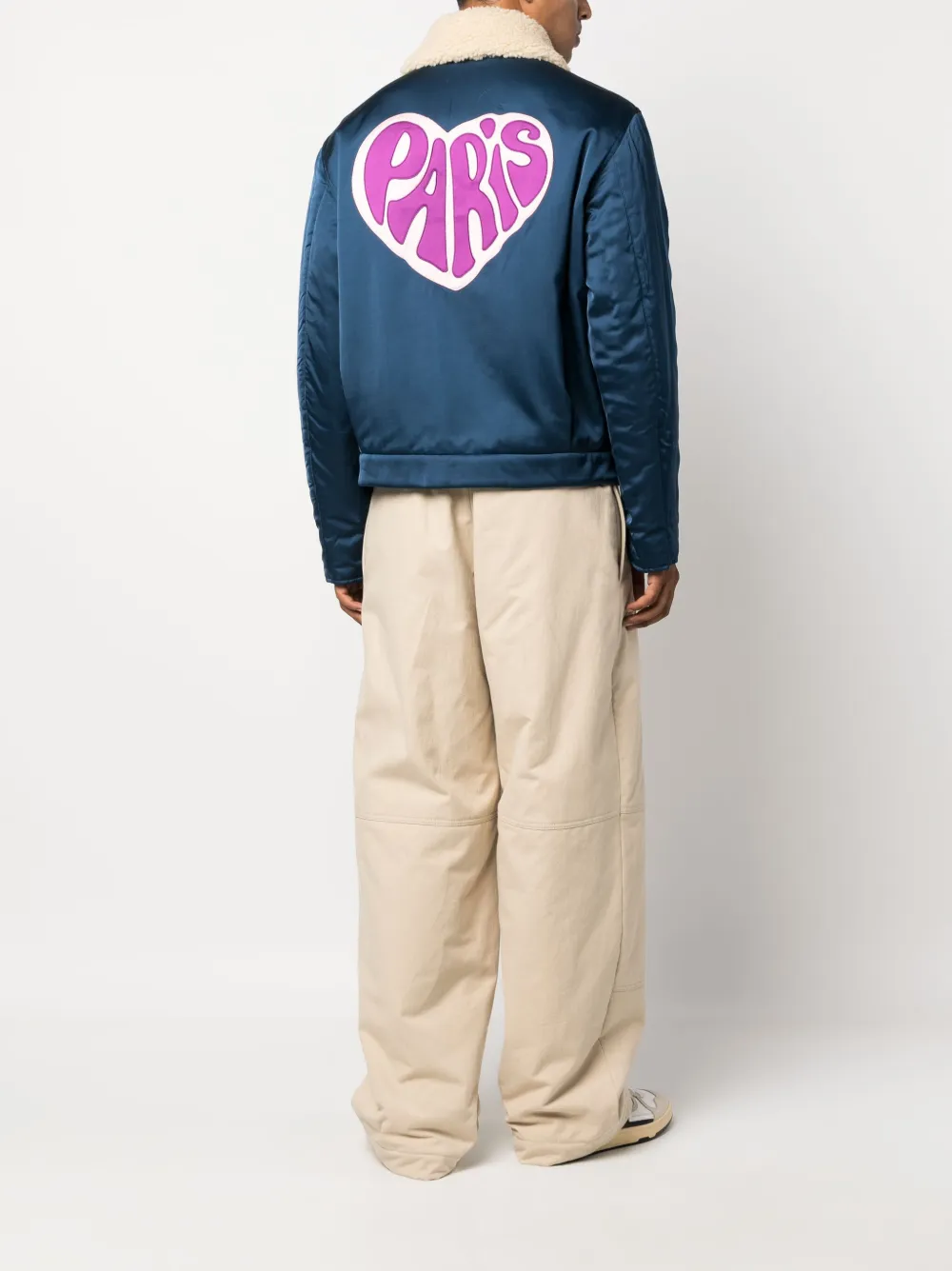 Синий, смесовый хлопок, вышитый логотип на груди, текстовый принт, узор с сердцами, воротник из овечьей шерсти, застежка на пуговицах спереди, длинные рукава, два передних кармана с листочкой и прямой подол.