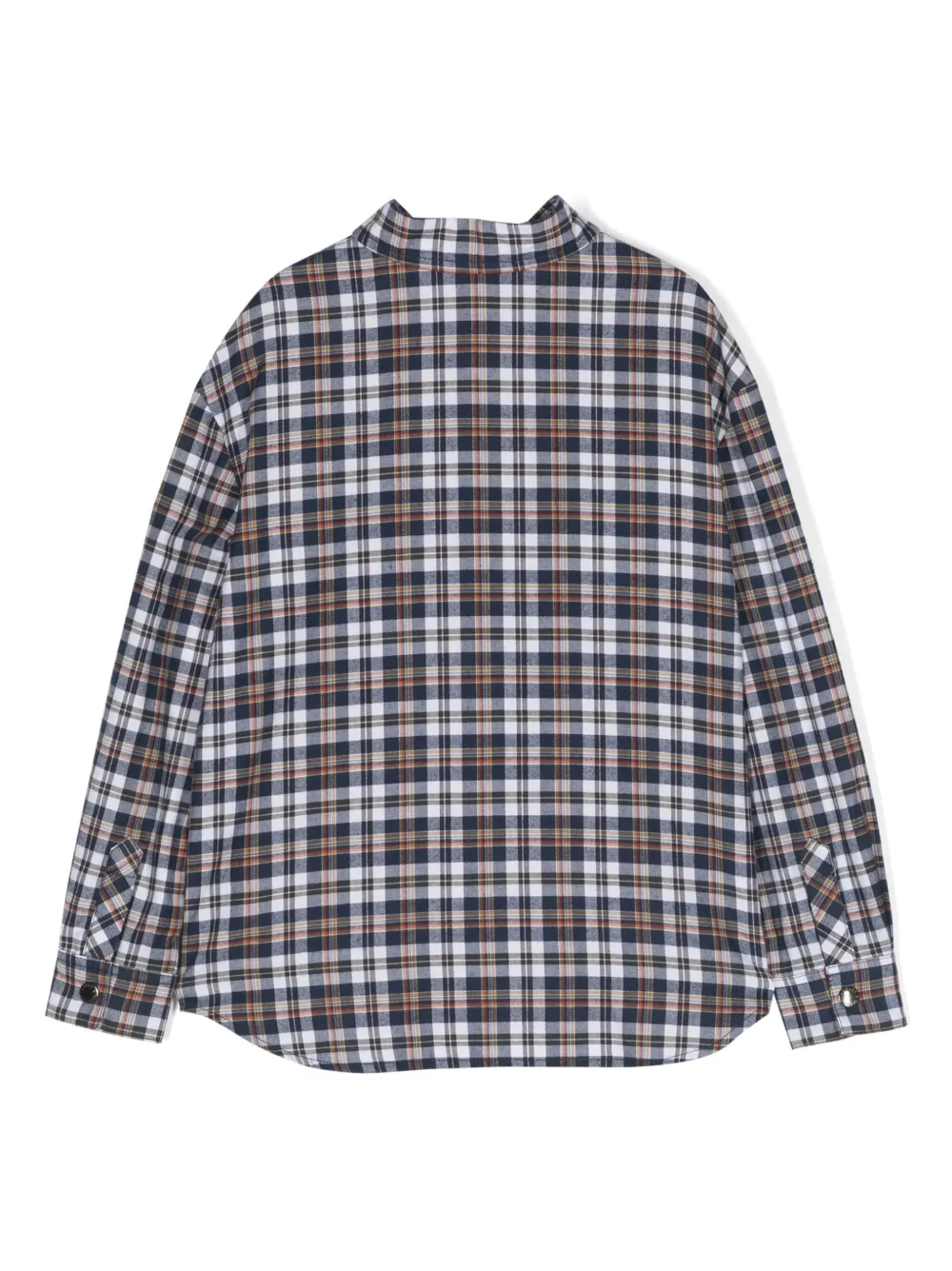 Принт в клетку тартан, серебристый металлический логотип, воротник на пуговицах, застежка на пуговицах спереди, длинные рукава, манжеты на пуговицах и закругленный подол.