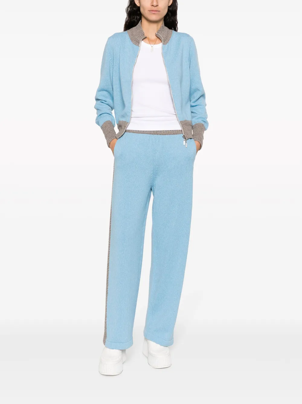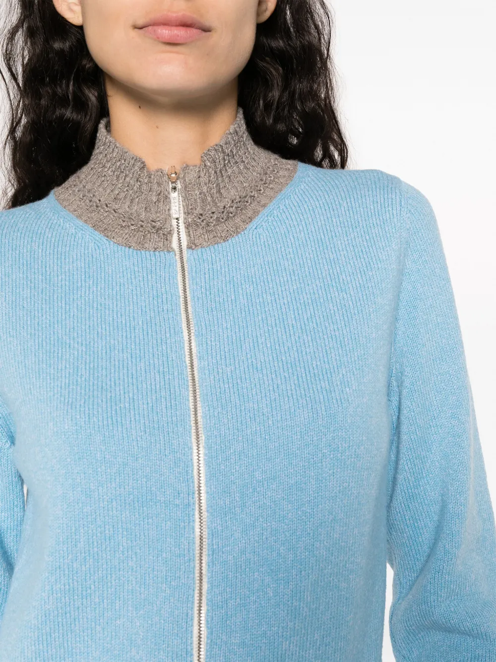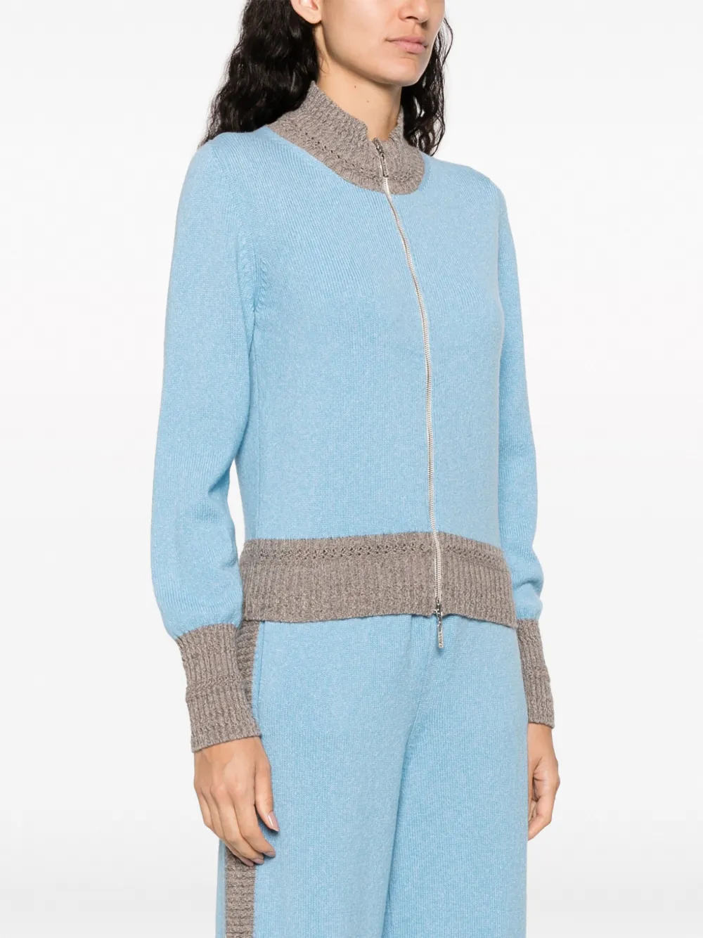 Расцветка Light Brown, голубой, кашемир, сочетание двух оттенков, трикотажный материал, отделка в рубчик, высокий воротник, застежка на молнии спереди, длинные рукава и прямой подол.