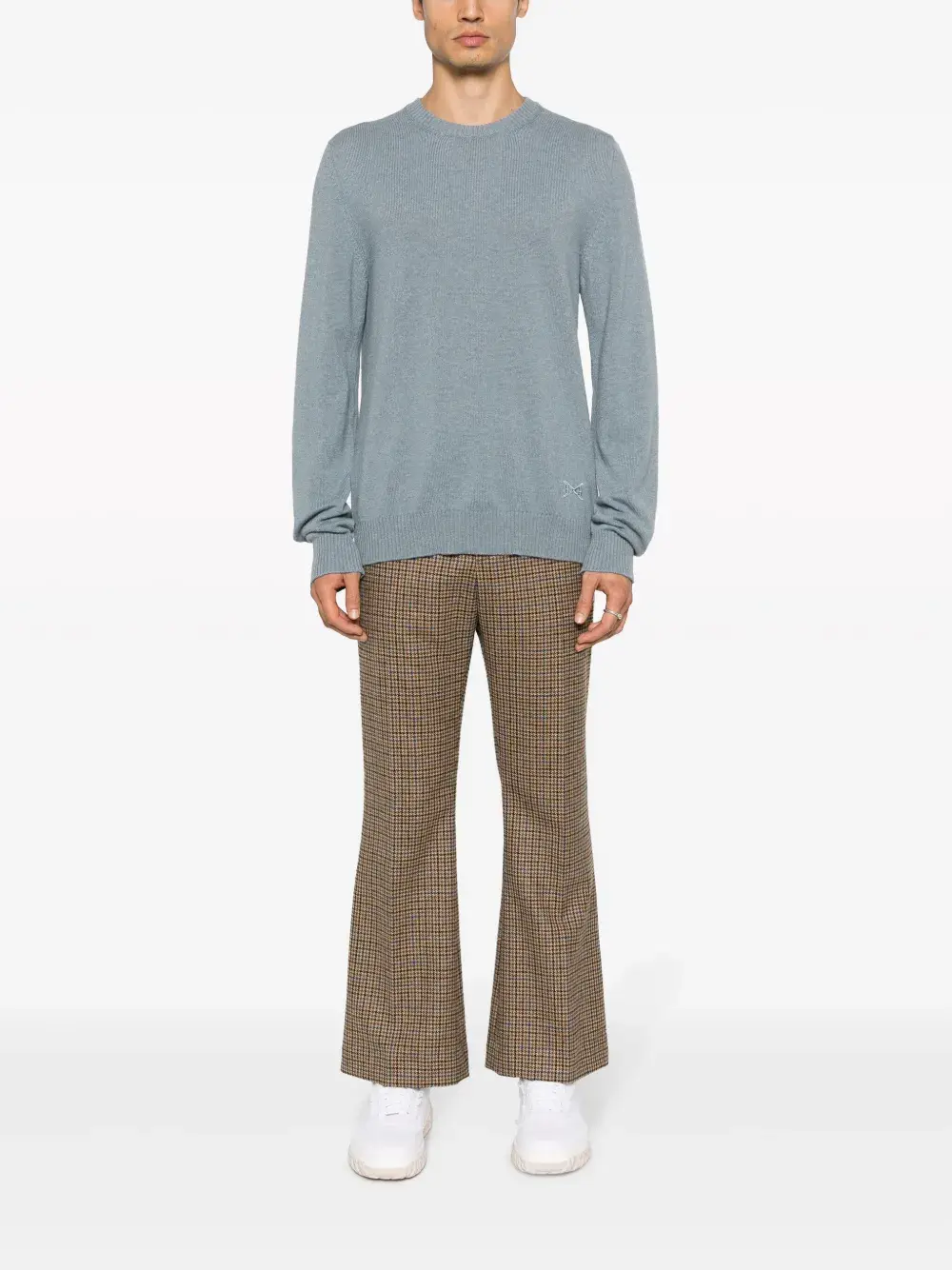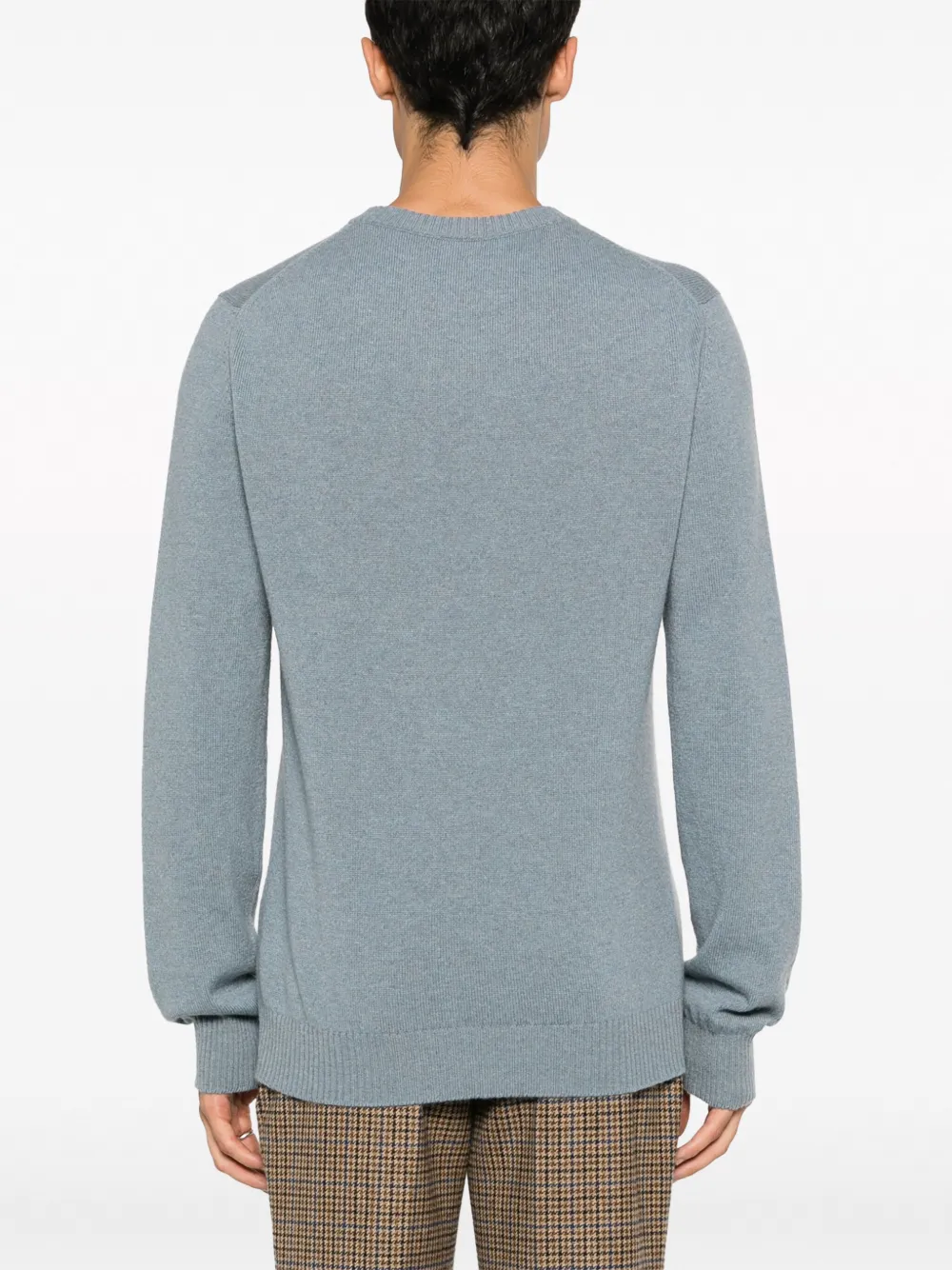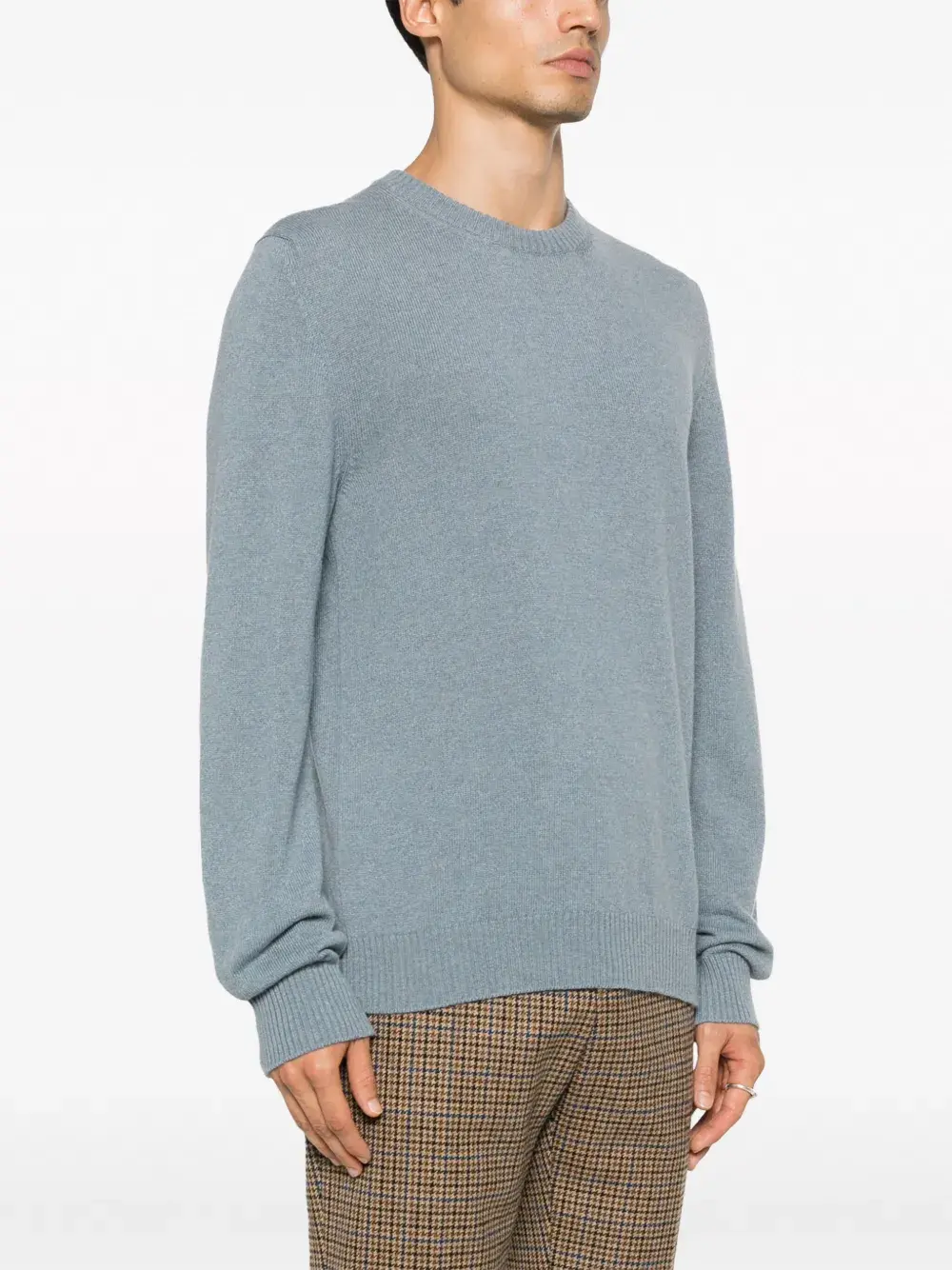 Сине-серый, кашемир, тонкая вязка, вышитый логотип сбоку, круглый вырез, длинные рукава и прямой подол.