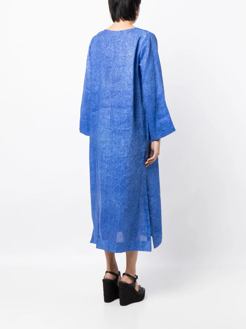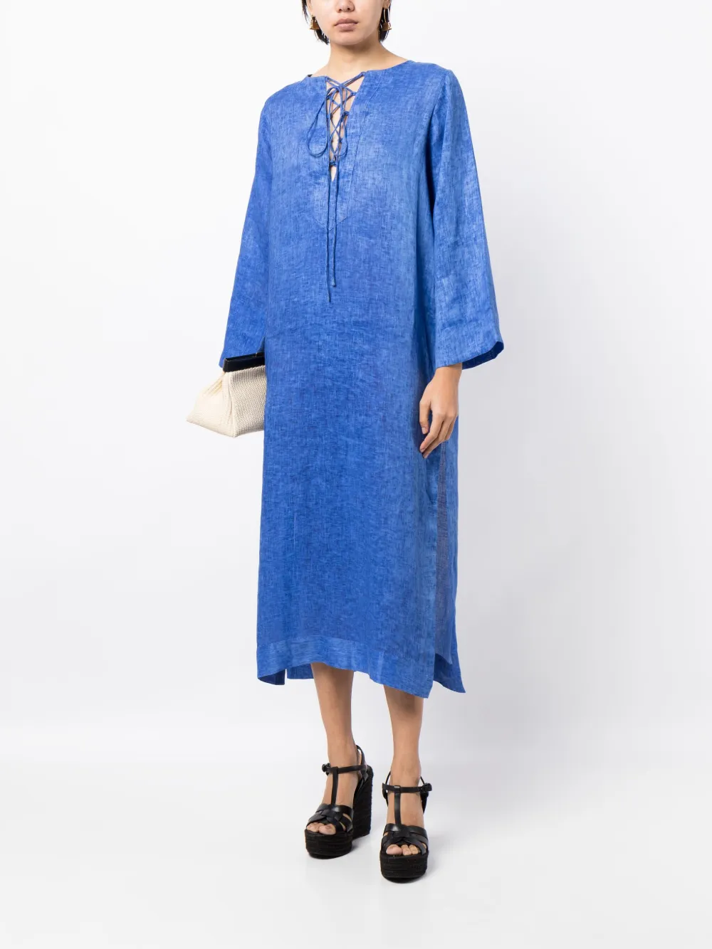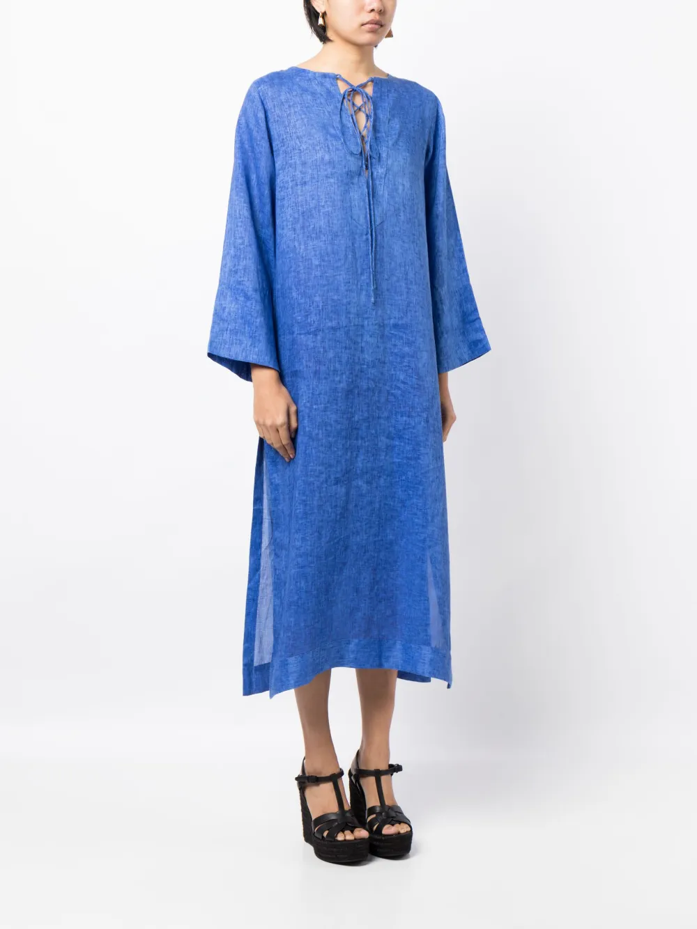 Подробнее о товаре: Расцветка Ocean Blue, лен, воротник с разрезом, шнуровка спереди, длинные широкие рукава, длина до середины голени, боковые разрезы и прямой подол. Этот товар как минимум на 50% состоит из материалов, которые признаны более безопасными для окружающей среды, и/или произведены с использованием методов, которые помогают сократить потребление воды и химических веществ. Узнать больше о том, какие товары получают отметку «Ответственный выбор», можно из материала «Как мы оцениваем экологичность и этичность».
