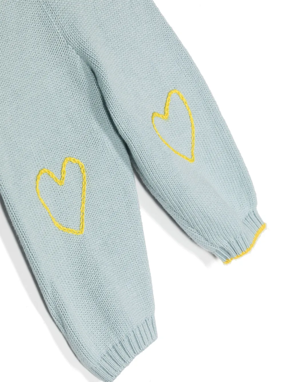 Голубой, лимонный, смесь хлопка и кашемира, трикотажный материал, контрастная отделка, вышитый узор, узор с сердцами, эластичный пояс и эластичные манжеты.