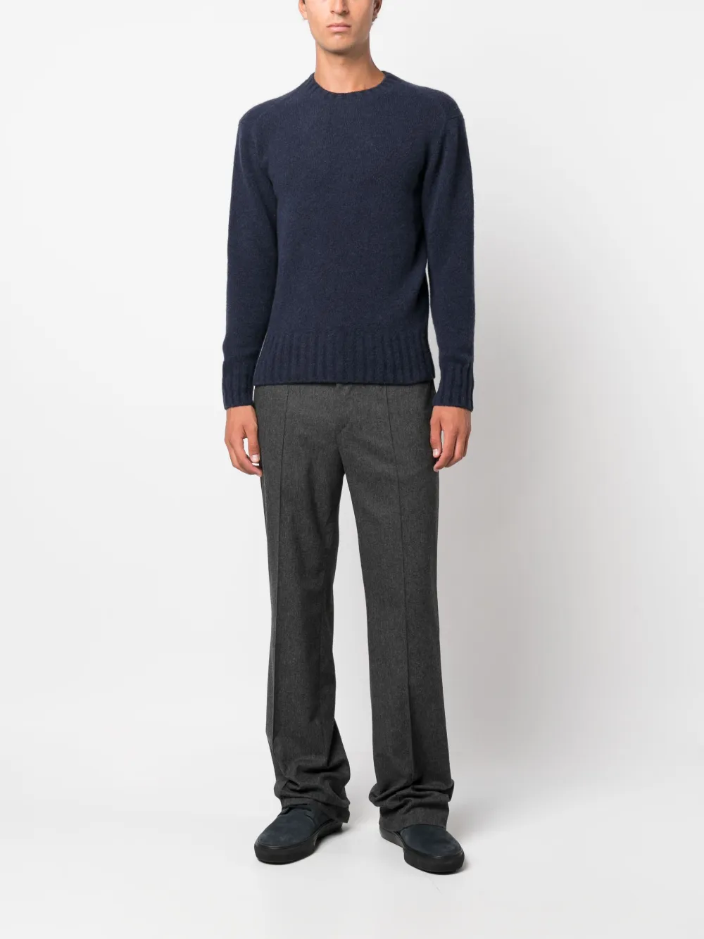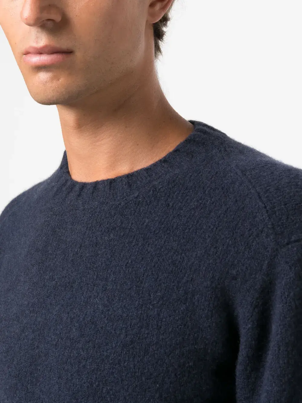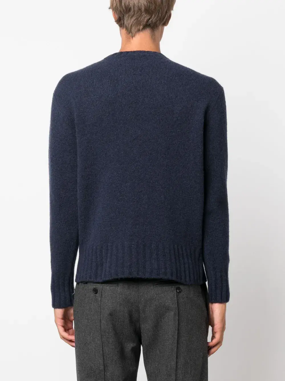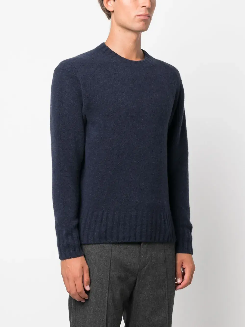 Темно-синий, смесовая шерсть, тонкая вязка, круглый вырез и длинные рукава.