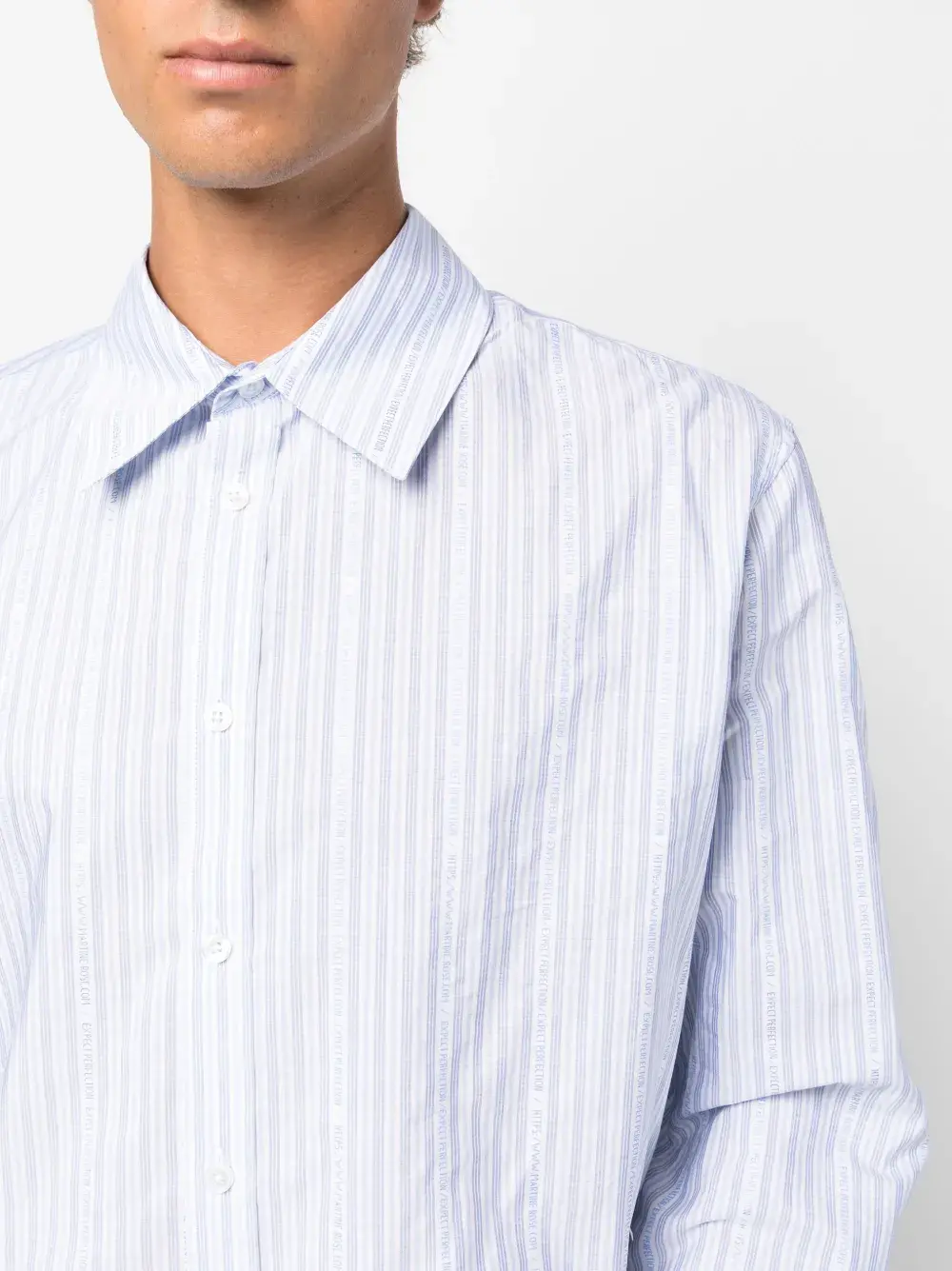 Синий/белый, хлопок, поплин, принт в вертикальную полоску, сплошной принт с логотипом, принт с надписью, классический воротник, застежка на пуговицах спереди, длинные рукава и закругленный подол.