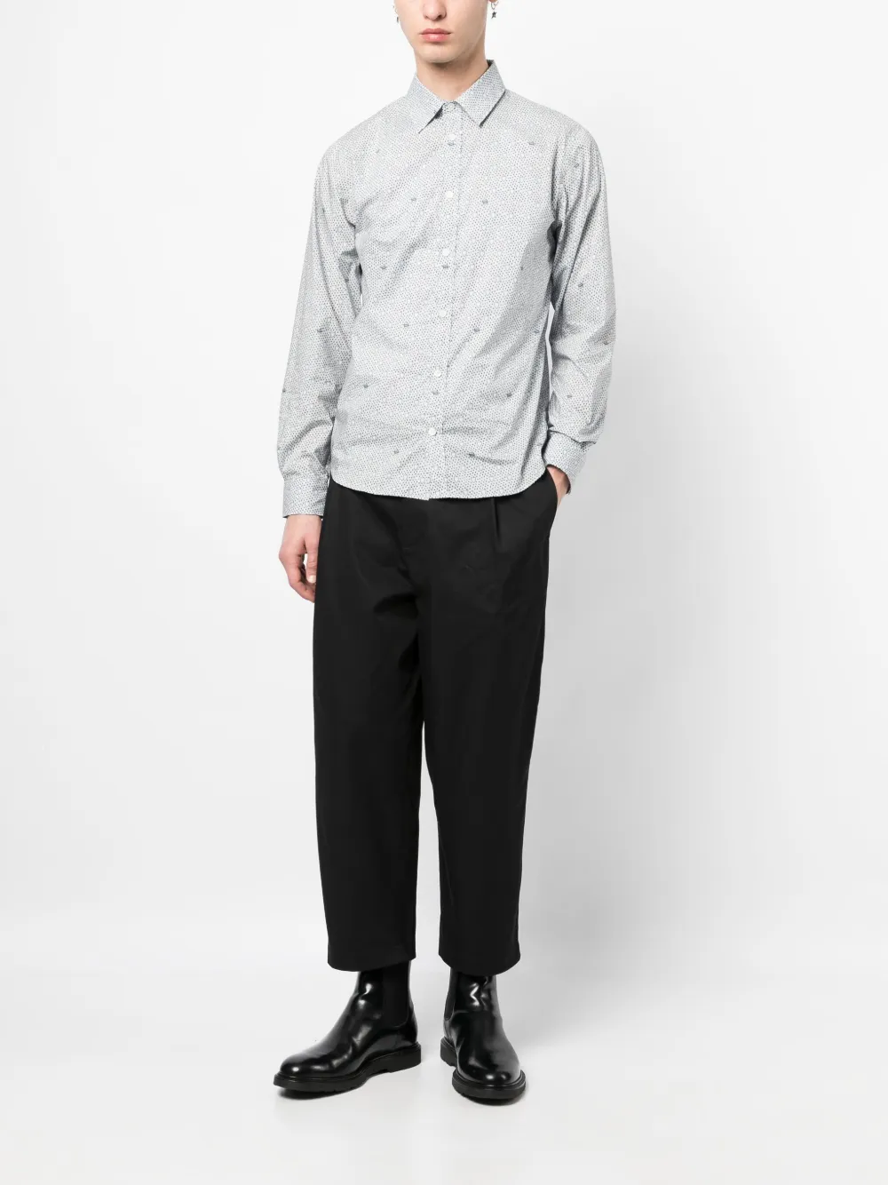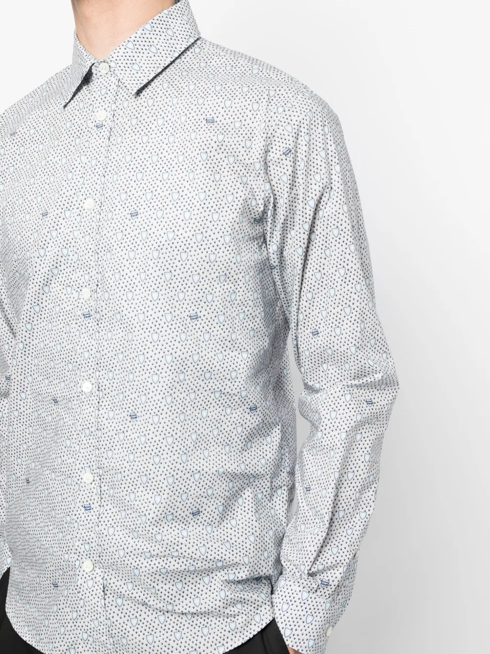 Расцветка Cloud White, темно-синий, хлопок, сплошной графичный принт, встречная складка, плоский заостренный воротник, застежка на пуговицах спереди, длинные рукава, манжеты на пуговицах и прямой подол.