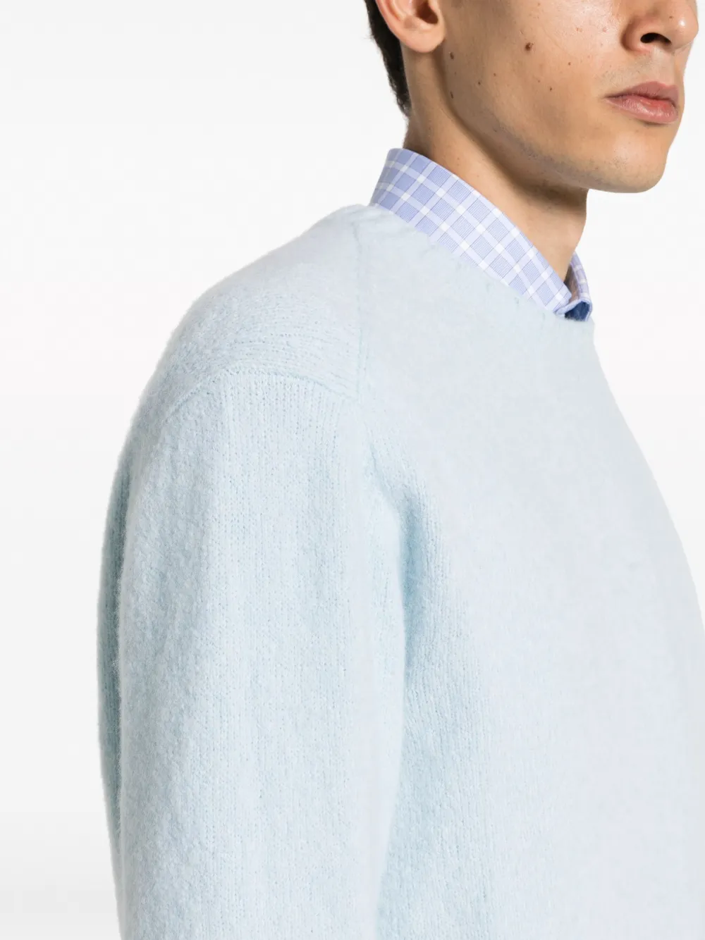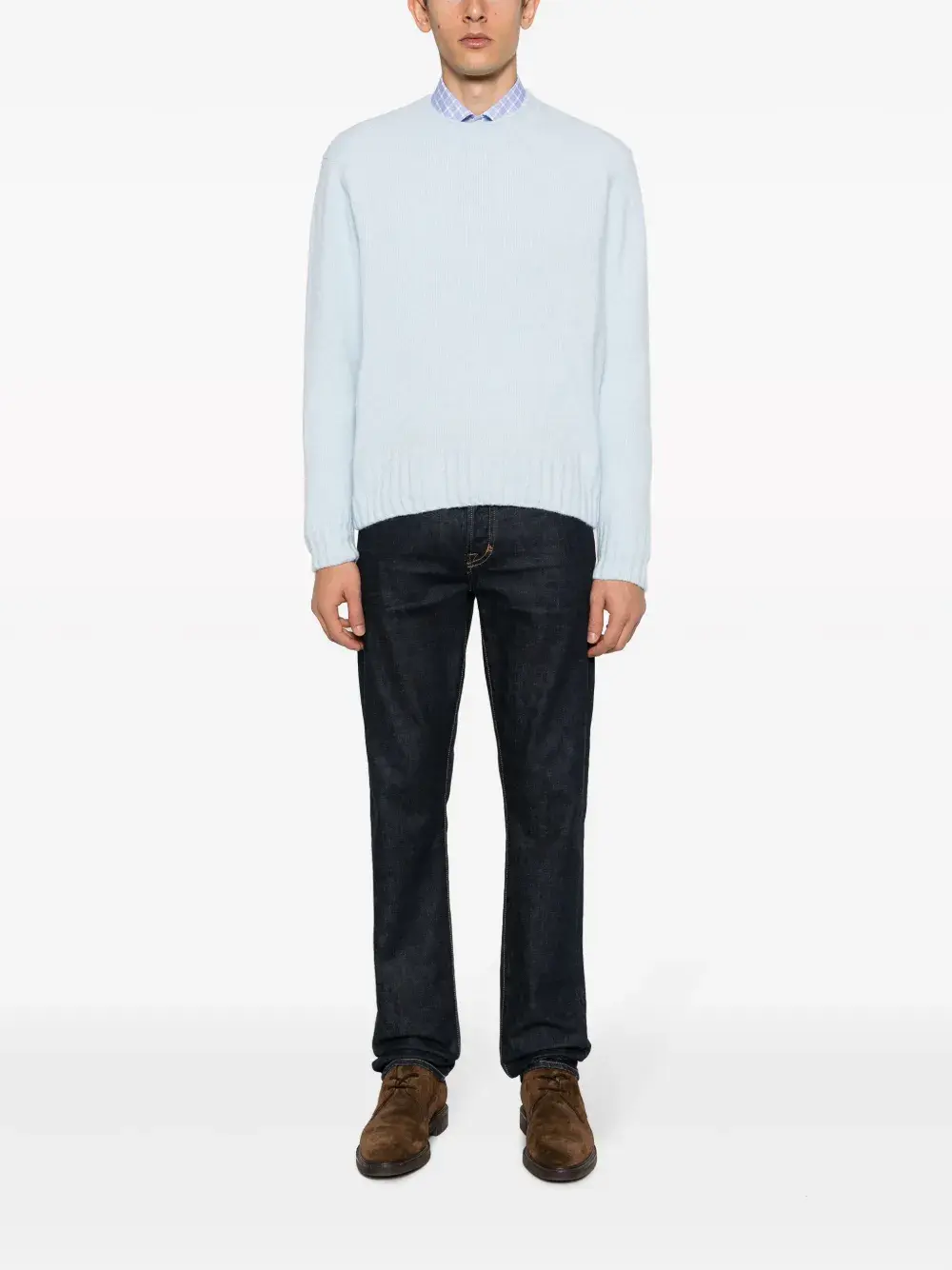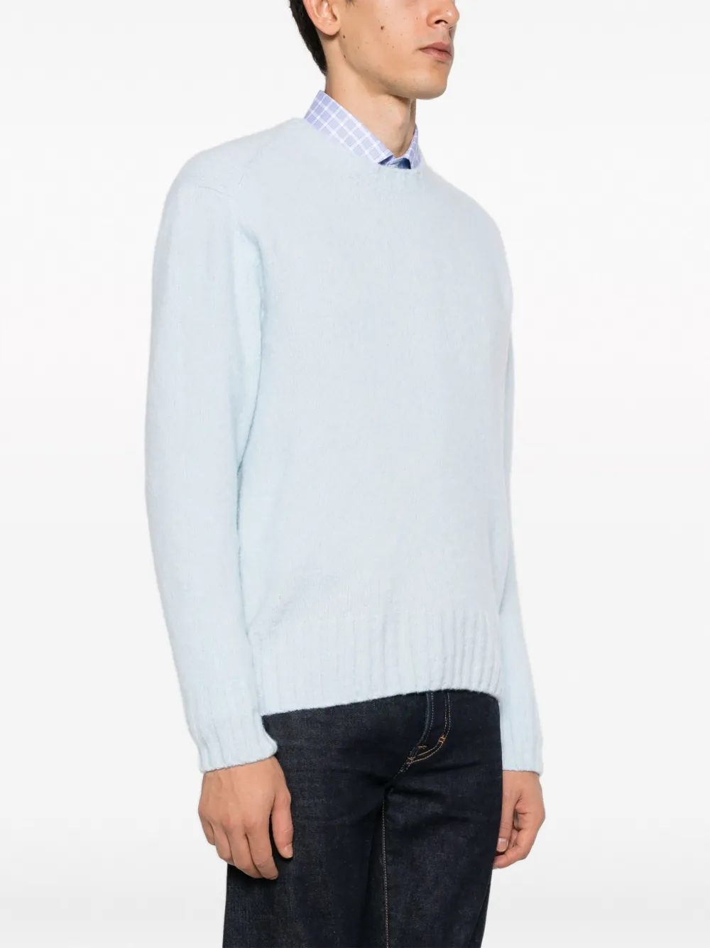 Голубой, смесь шерсти и кашемира, тонкая вязка, отделка в рубчик, круглый вырез, длинные рукава и прямой подол.