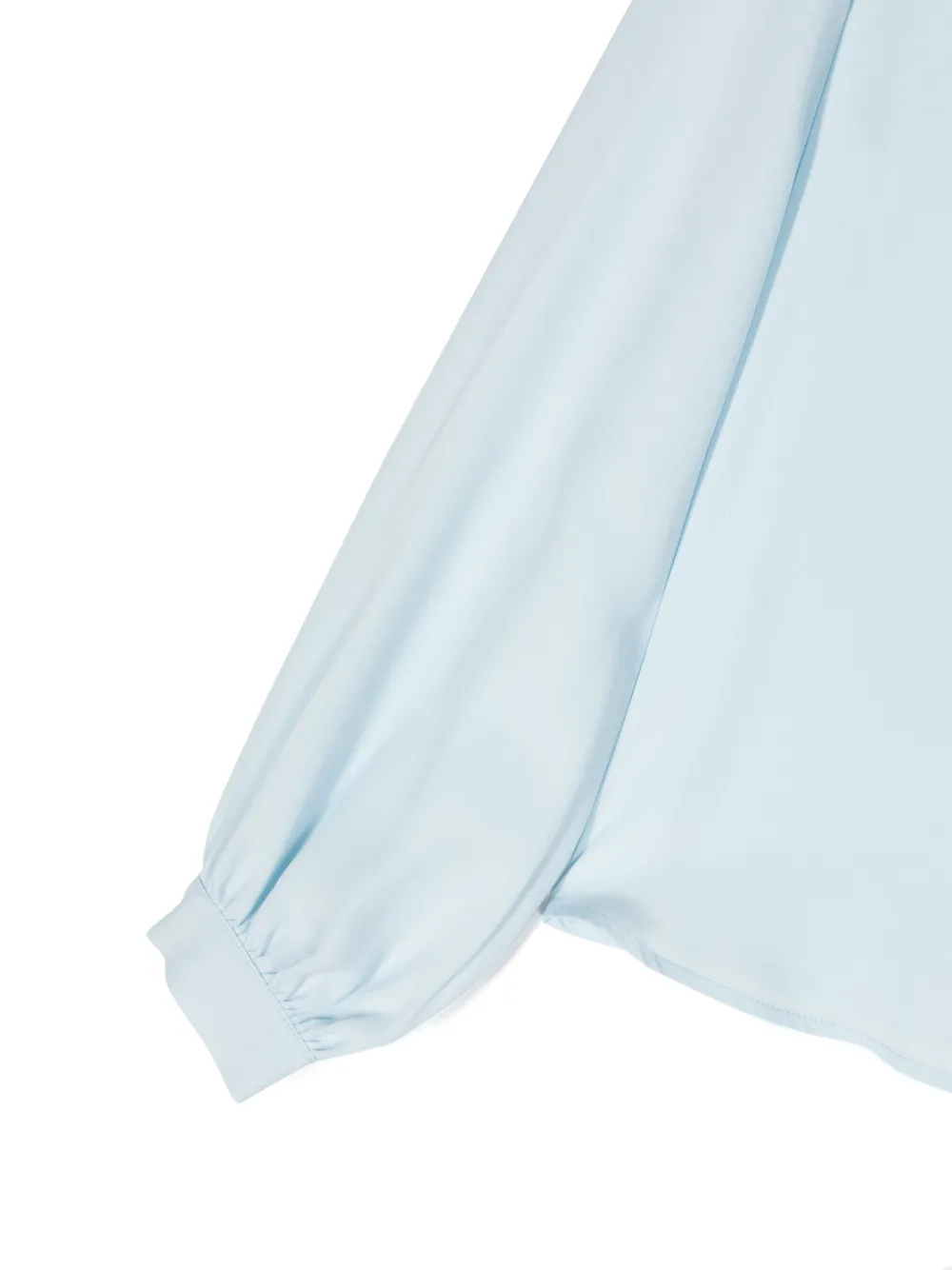 Нежно-голубой, воротник Питер Пэн, длинные рукава, манжеты на пуговицах, застежка на пуговицу сзади и прямой подол.