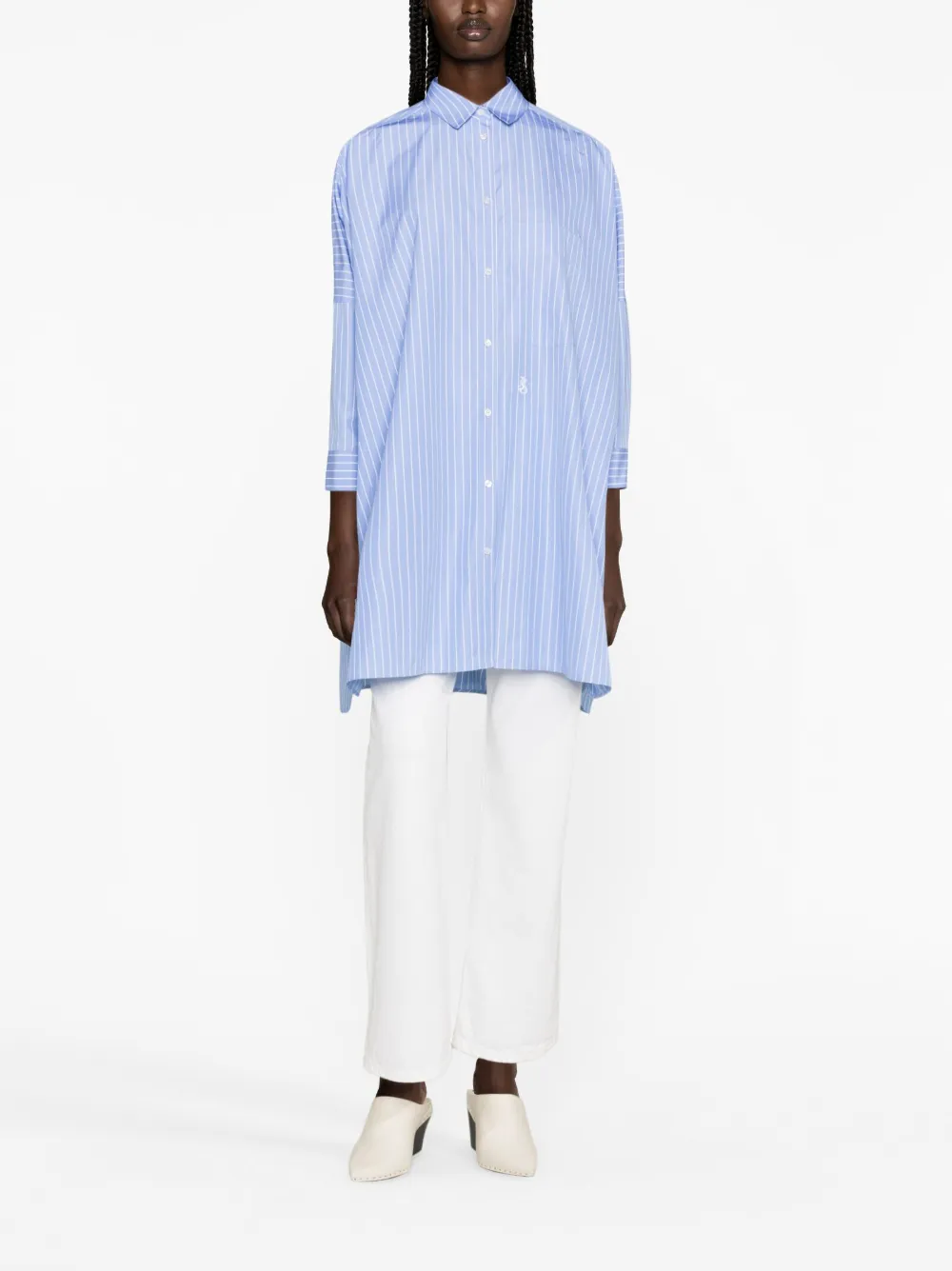 Синий/белый, хлопок, узор в полоску нескольких видов, классический воротник, планка на пуговицах спереди, нагрудный накладной карман, приспущенные плечи, рукава три четверти, прямой подол и боковые разрезы.