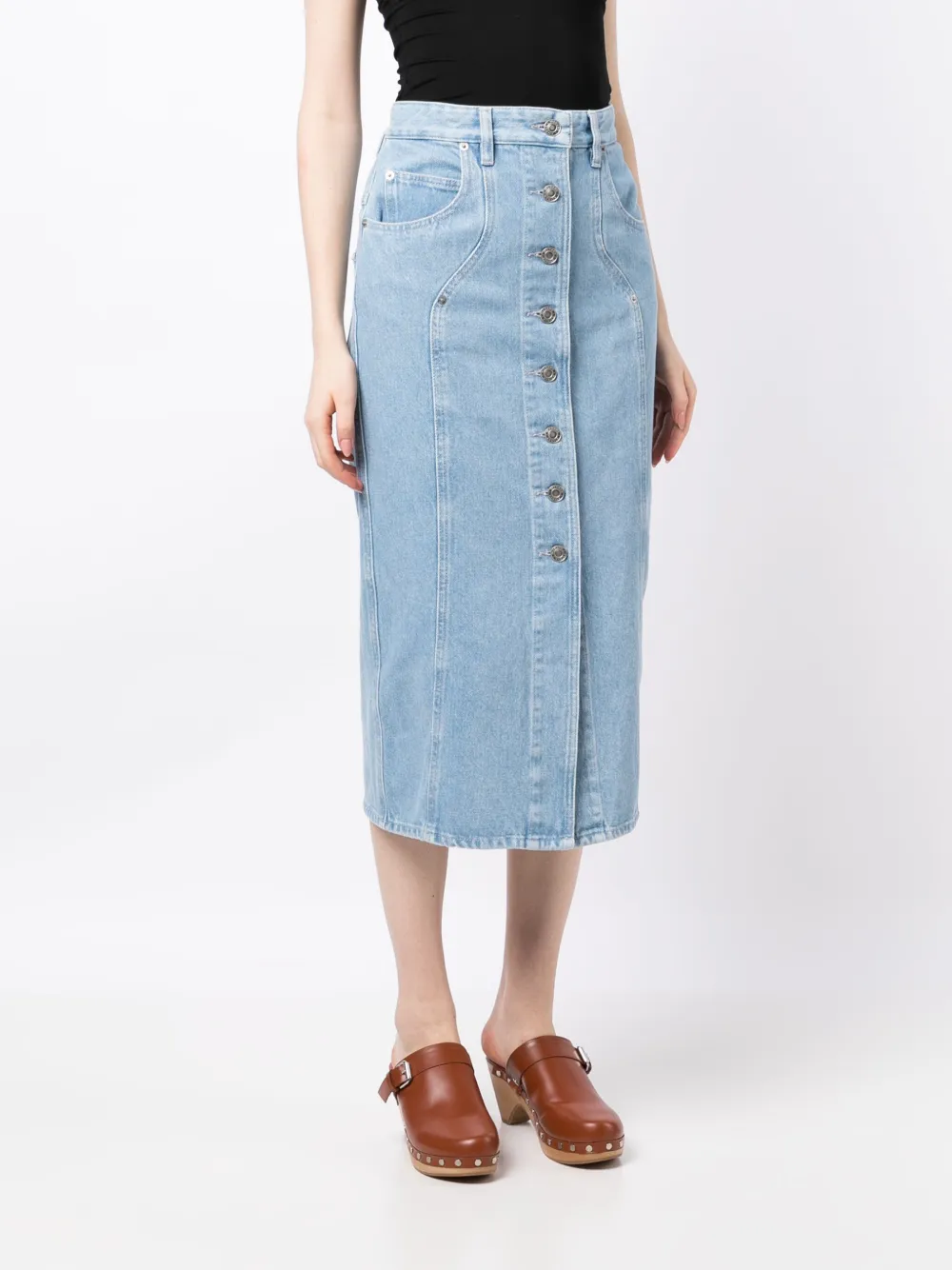 Обработанный деним, нашивка с логотипом сзади, серебристые пуговицы с тиснением, средняя посадка, петли для ремня, застежка на пуговицах спереди, пять карманов и длина миди.
