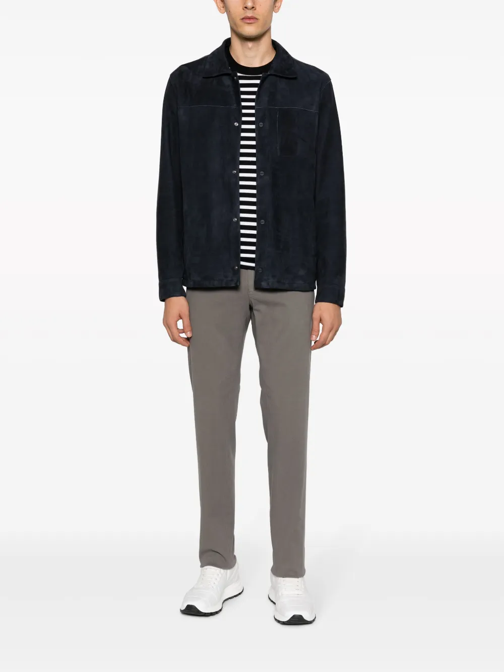 Темно-синий, замша из козьей кожи, декоративные швы, классический воротник, пуговицы с выгравированным логотипом, длинные рукава, нагрудный накладной карман, подкладка из хлопка и прямой подол.