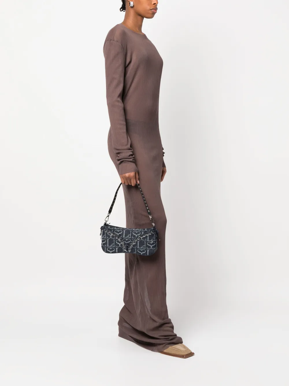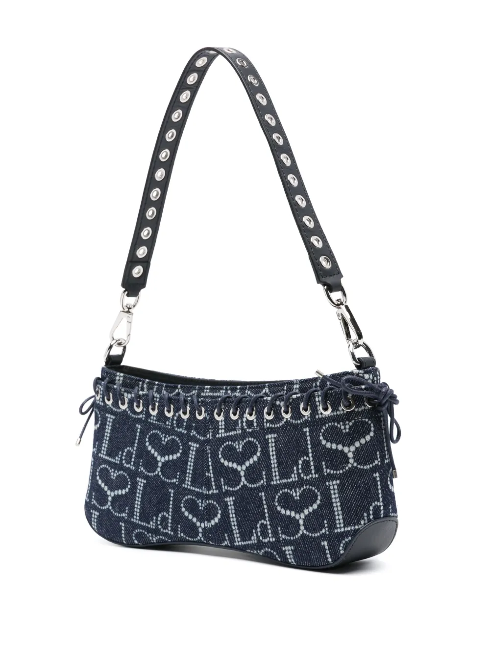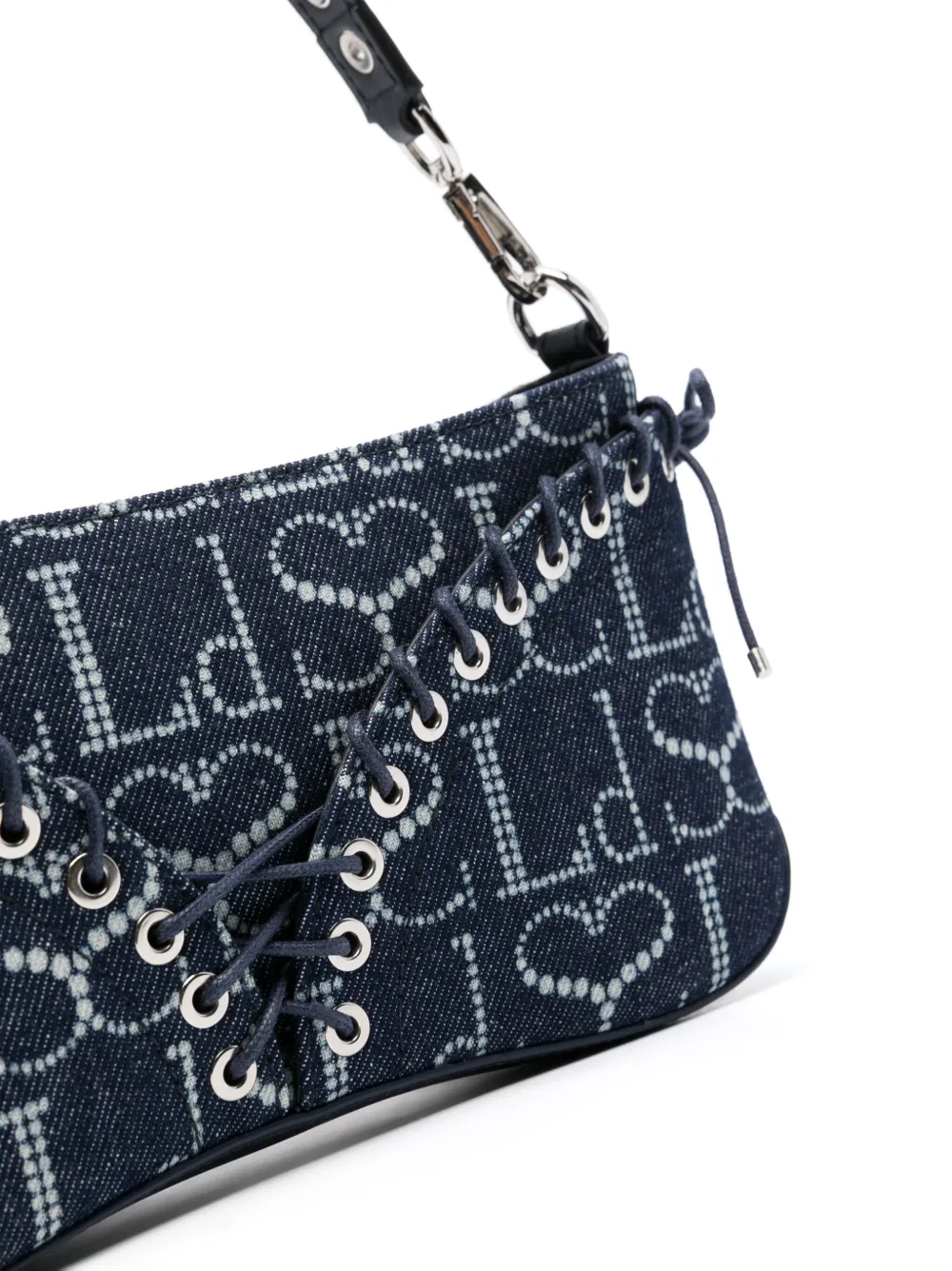 Индиго, деним, хлопок, сплошной принт с логотипом, шнуровка, съемный ремень на плечо, застежка на молнии сверху, основное отделение, внутренний прорезной карман, нашивка с логотипом внутри и серебристая фурнитура.