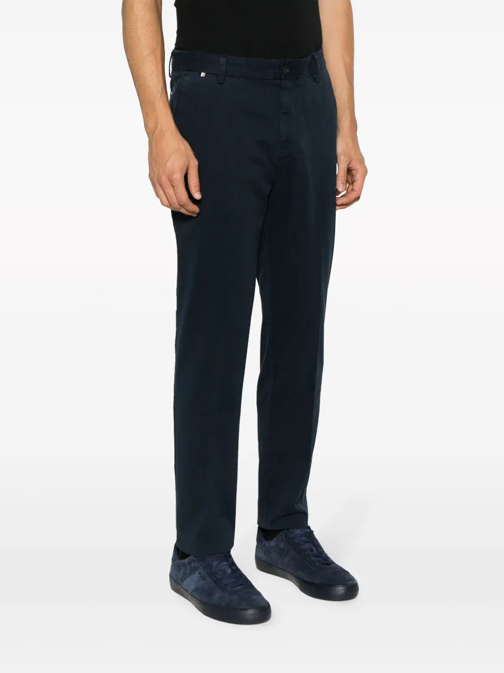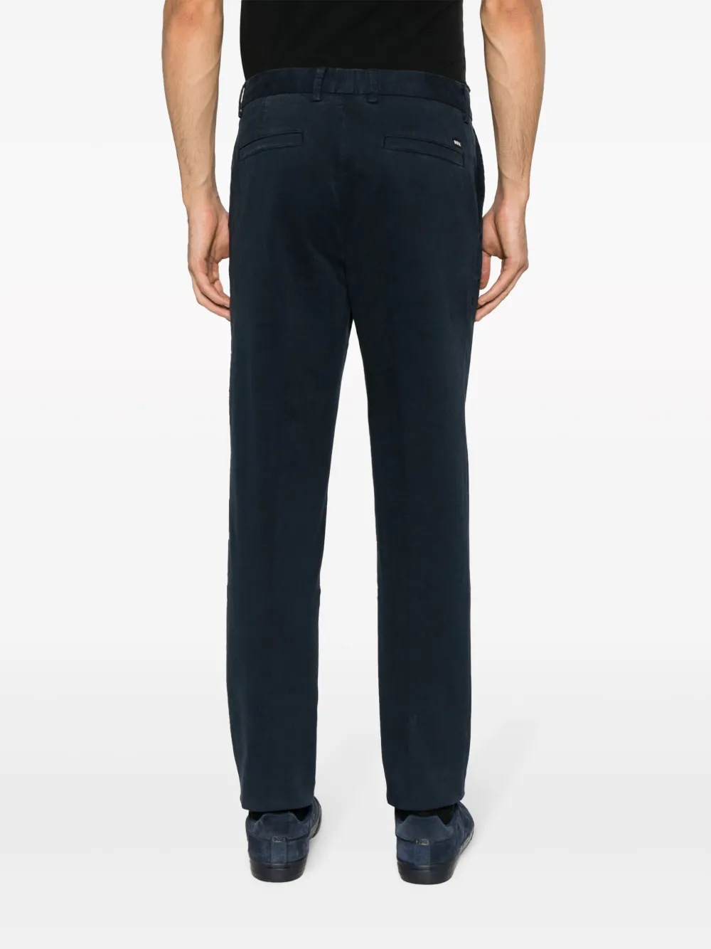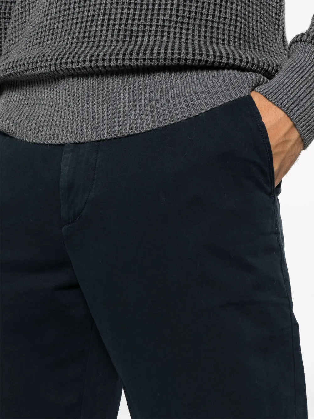 Темно-синий, эластичный хлопок, маленькая подвеска с логотипом, петли для ремня, застежка на молнии и пуговице спереди, средняя посадка, зауженный крой, два вшитых кармана по бокам и два кармана с листочкой сзади.