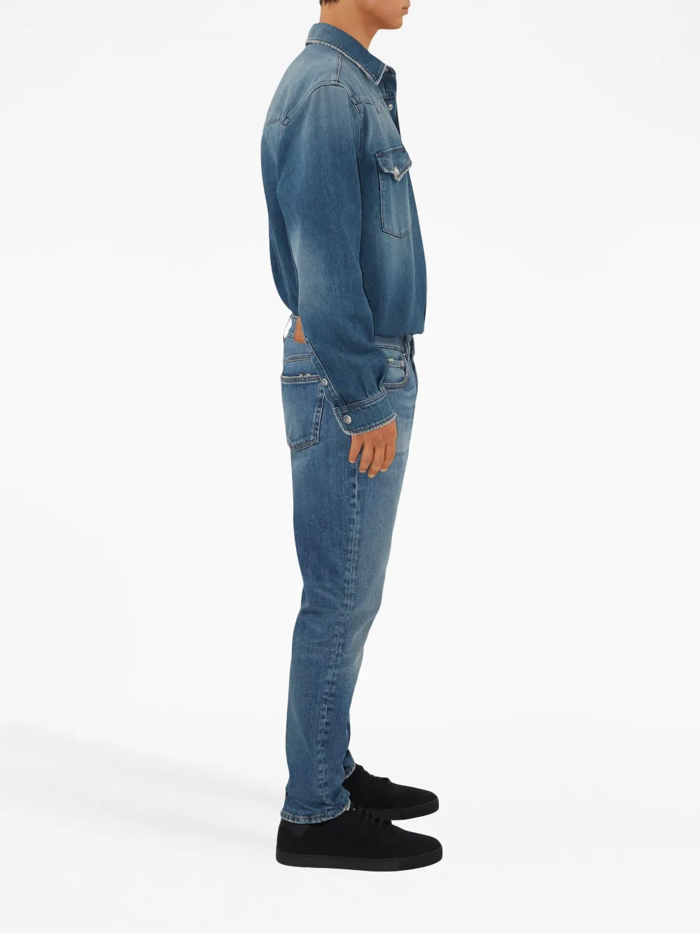 Синий, хлопок, деним, отложной воротник, застежка на пуговицах спереди, длинные рукава, закругленный подол и нагрудный карман на двух пуговицах.