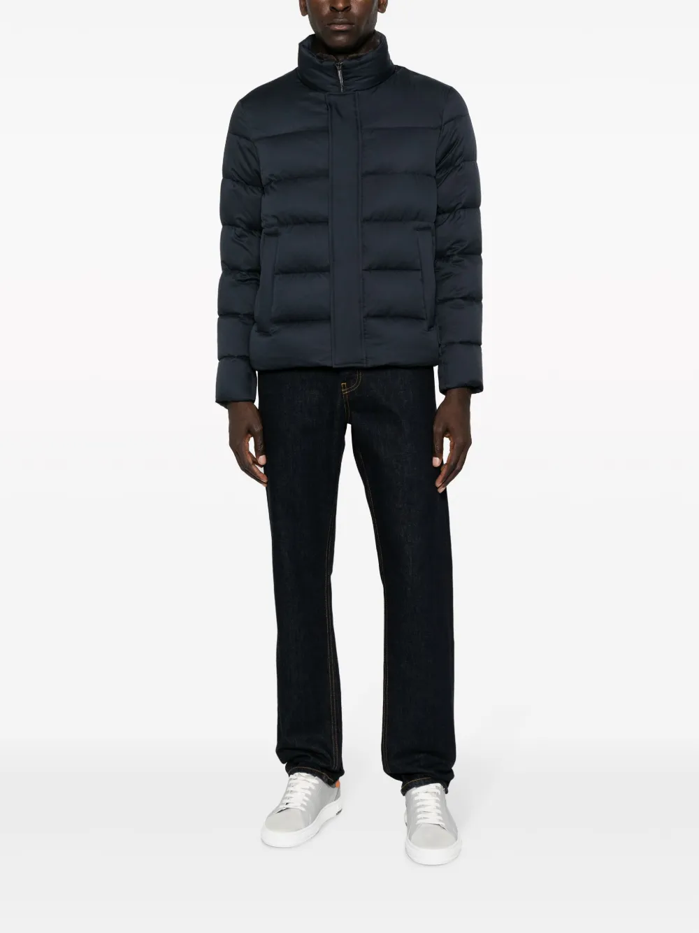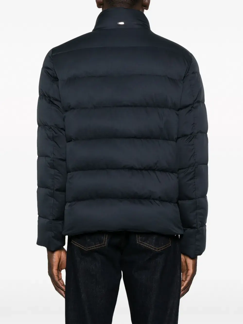 Темно-синий, наполнитель из пуха и перьев, дутый материал, серебристый металлический логотип, воротник-стойка, потайная молния спереди, два кармана по бокам, длинные рукава и прямой подол.