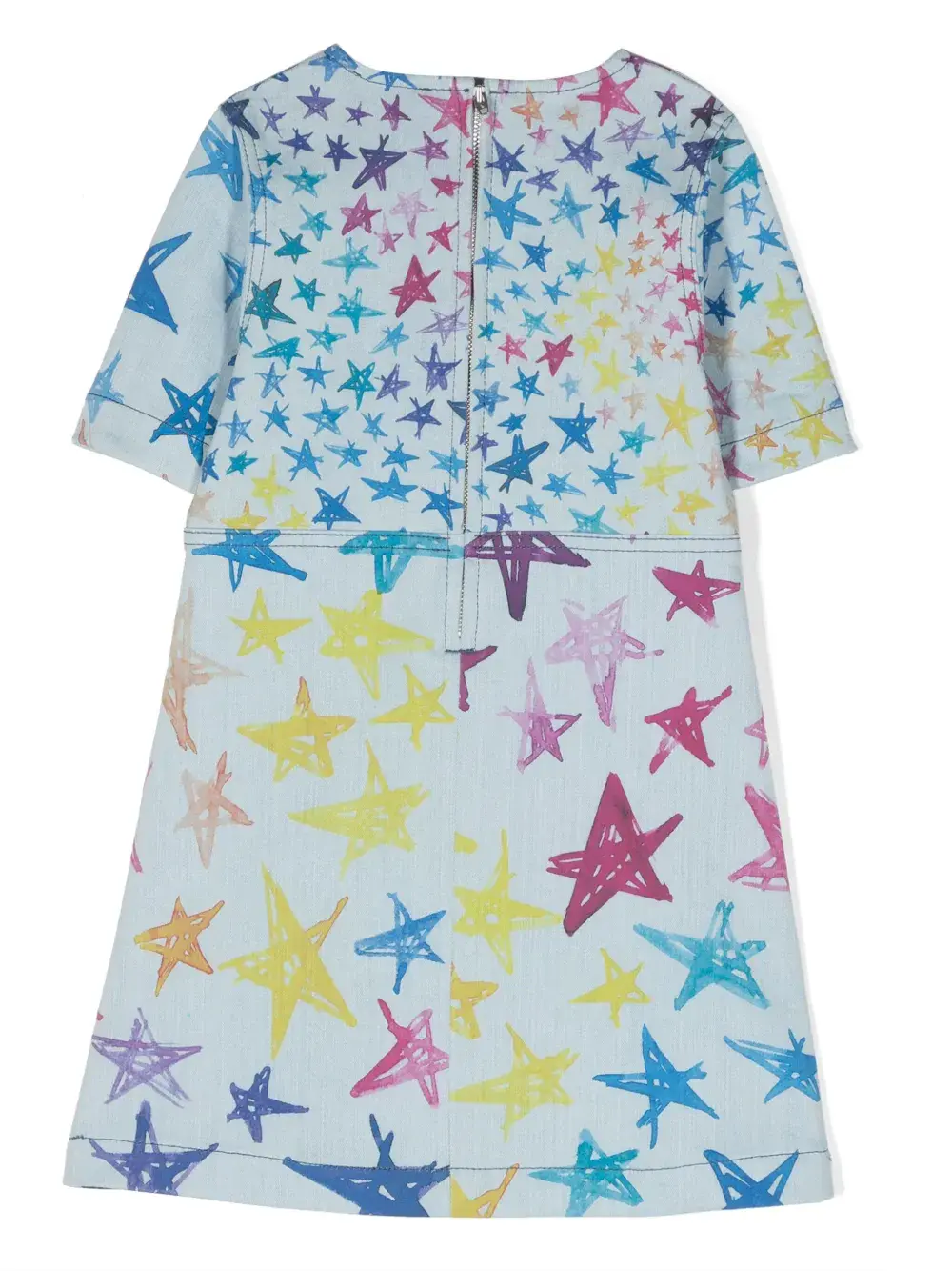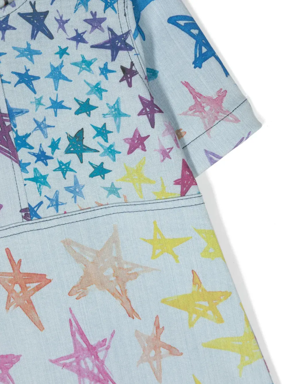Голубой, разноцветный, хлопок, деним, принт с изображением звезд, асимметричный вырез, застежка на молнии сзади, короткие рукава и прямой подол. Узнать больше о том, какие товары получают отметку «Ответственный выбор», можно из материала «Как мы оцениваем экологичность и этичность».