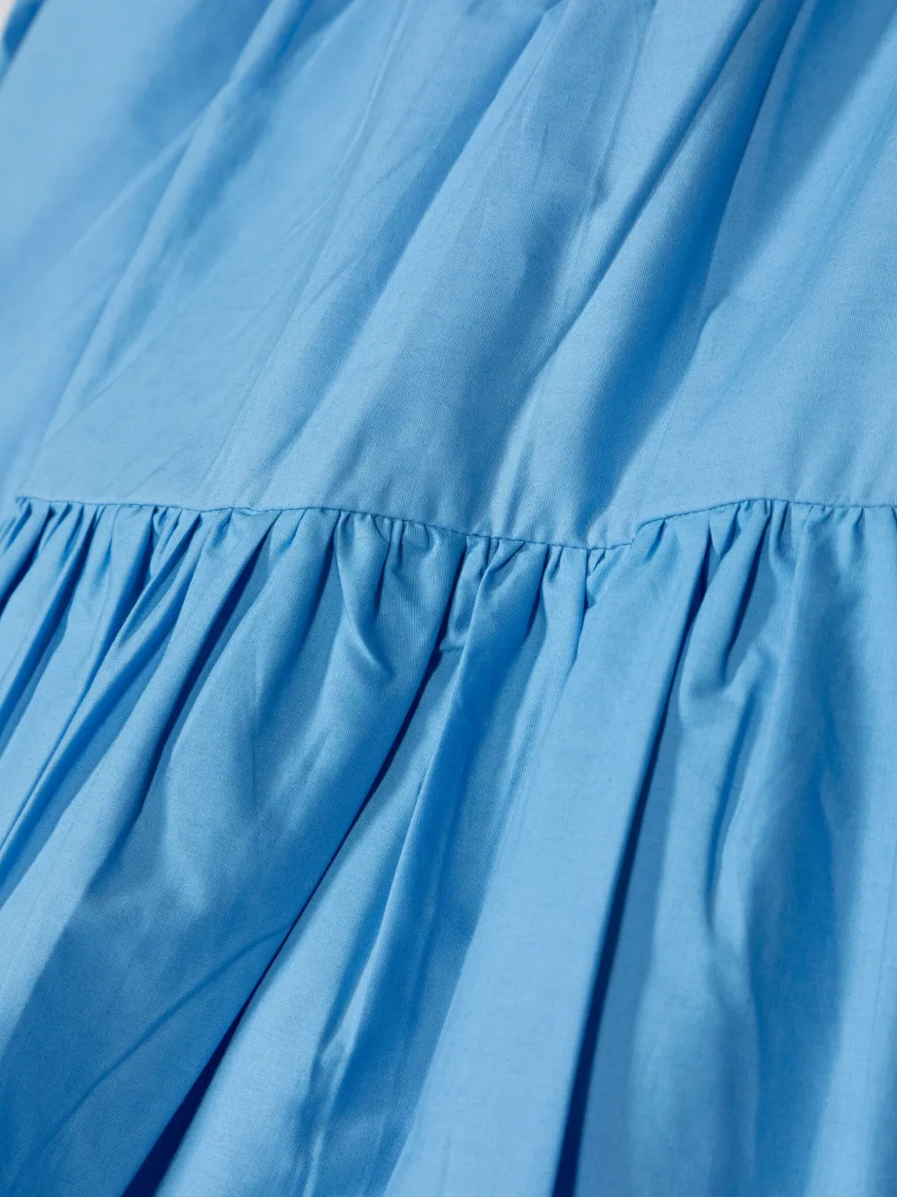 Голубой, органический хлопок, расклешенный крой, детали с оборками, модель на одном плече, эластичный пояс, короткие объемные рукава и подол с баской. Узнать больше о том, какие товары получают отметку «Ответственный выбор», можно из материала «Как мы оцениваем экологичность и этичность».