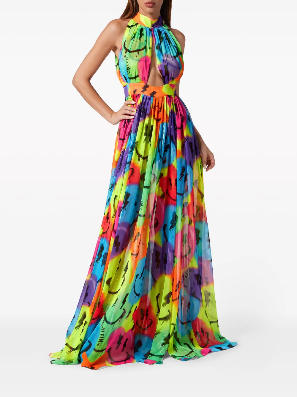 Разноцветный, шифон, абстрактный принт, вырез-петля халтер, вырезные детали, потайная застежка на молнии сзади, без рукавов, расклешенная юбка, боковой разрез и длина макси.