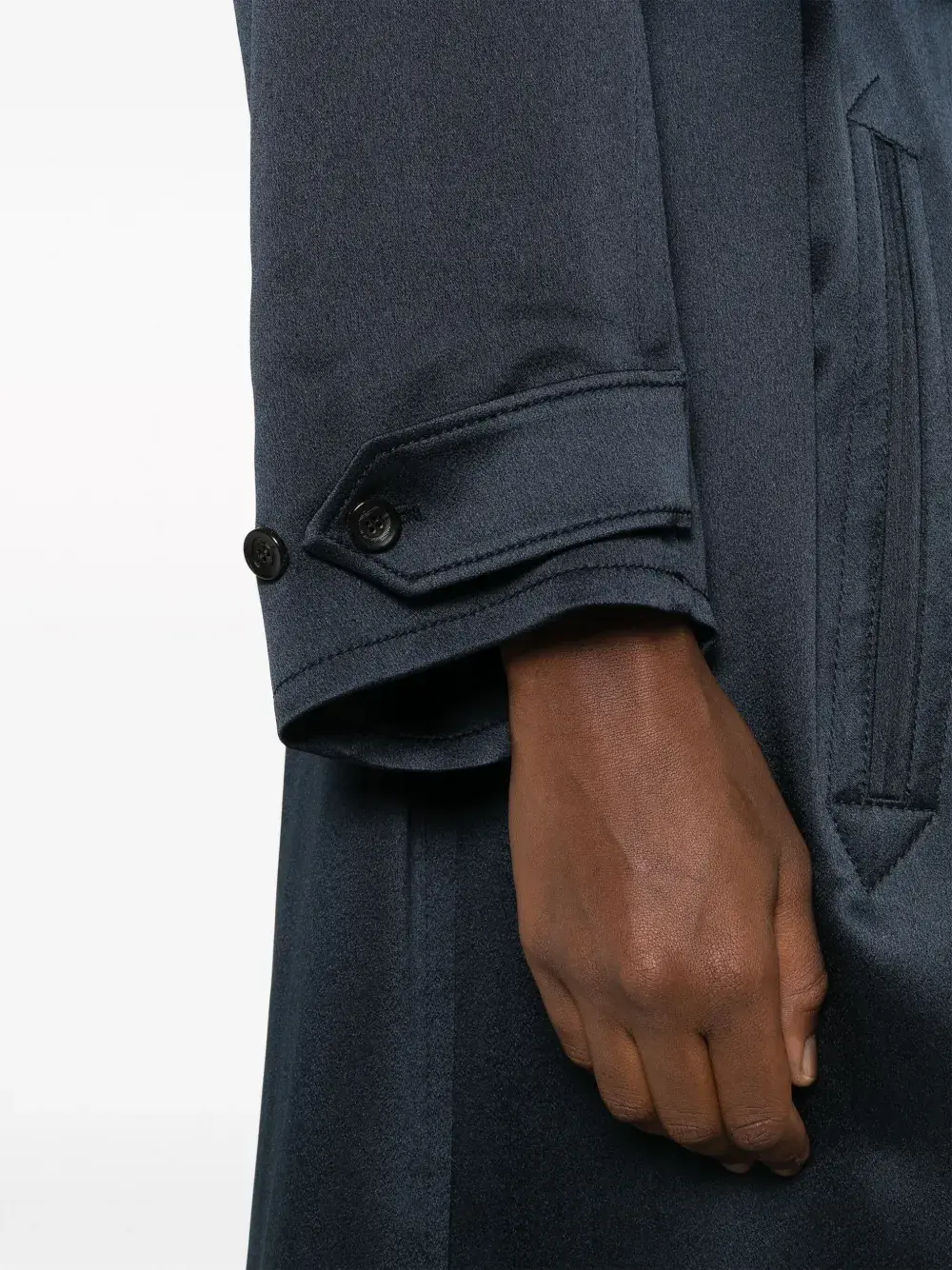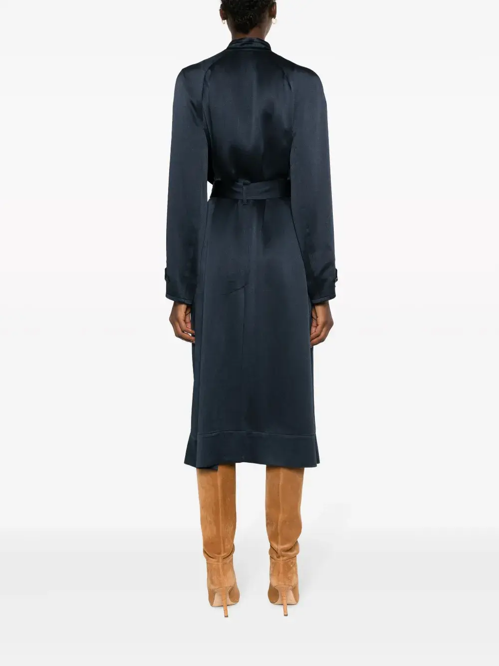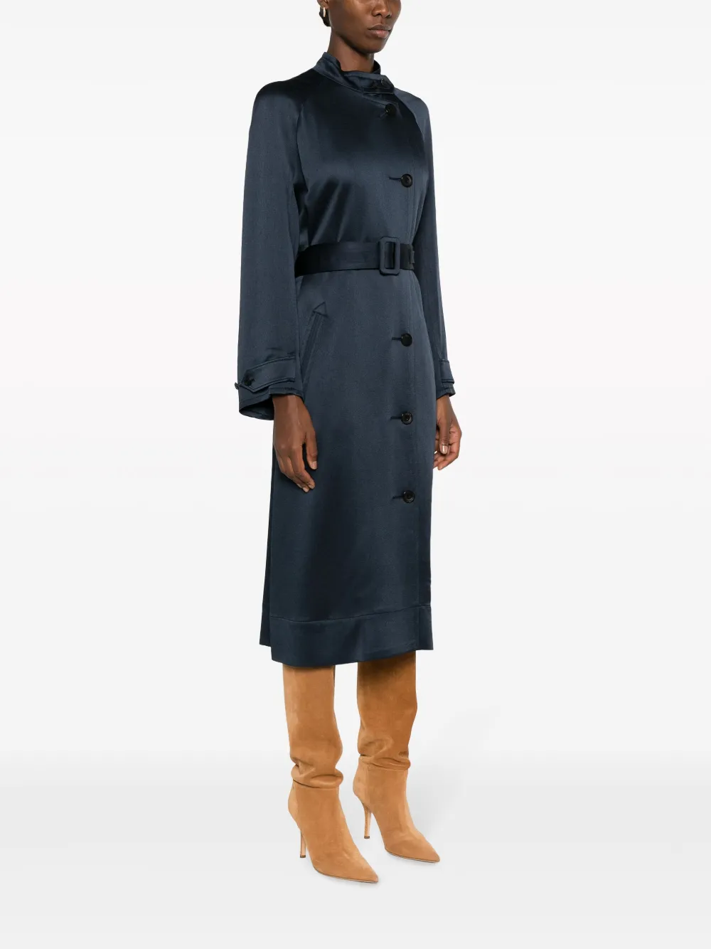 Темно-синий, сатиновая фактура, высокий воротник, двубортная застежка на кнопки, длинные рукава реглан, манжеты с ремешками, ремень на талии, два прорезных кармана спереди, прямой подол и длина миди.