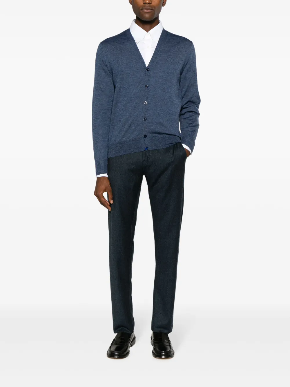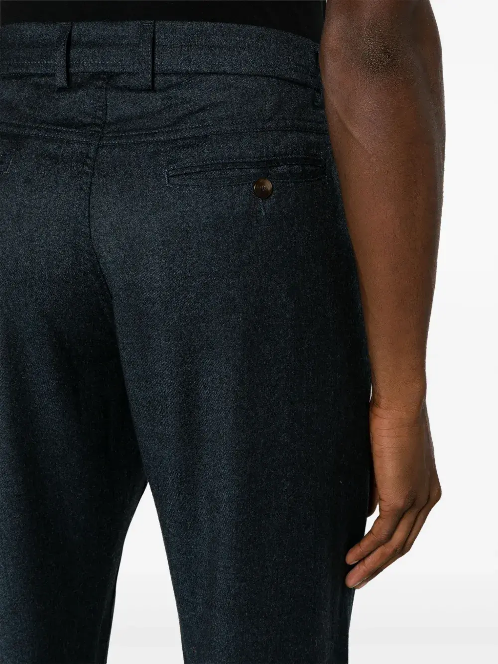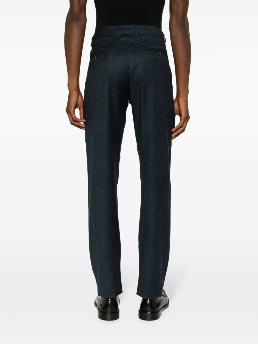 Темно-синий, шерсть, петли для ремня, кулиска на талии, средняя посадка, застежка на молнии и пуговице спереди, прямой крой, два вшитых кармана по бокам и два прорезных кармана на пуговицах сзади.