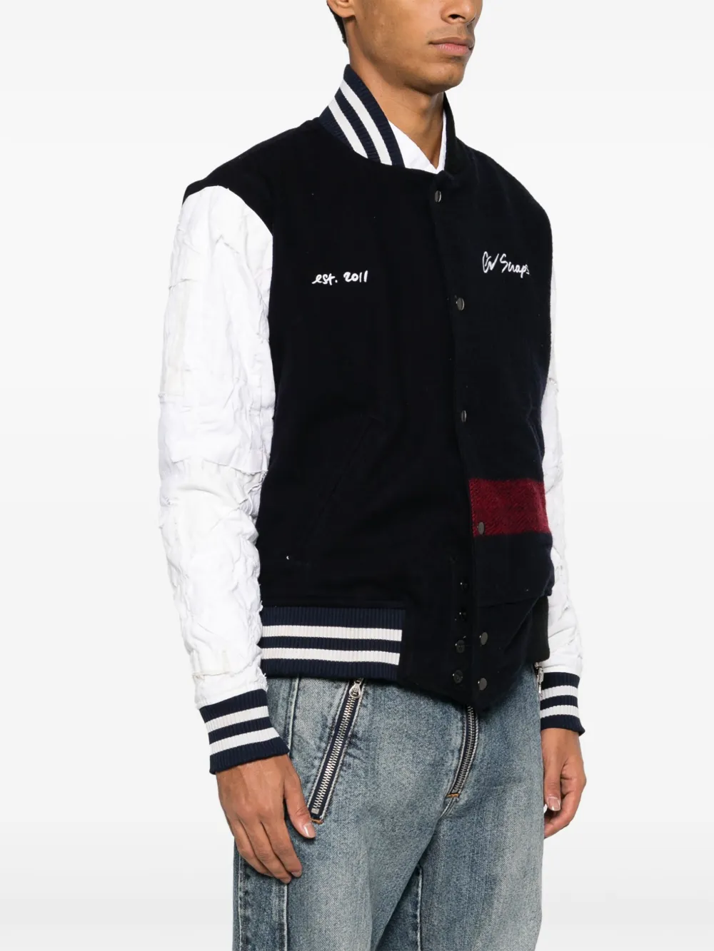 Подробнее о товаре: Темно-синий, белый, смесь хлопка и шерсти, вышитая надпись, края в полоску, воротник-стойка в рубчик, длинные рукава, застежка на кнопках спереди, два вшитых кармана по бокам и прямой подол. Узнать больше о том, какие товары получают отметку «Ответственный выбор», можно из материала «Как мы оцениваем экологичность и этичность».