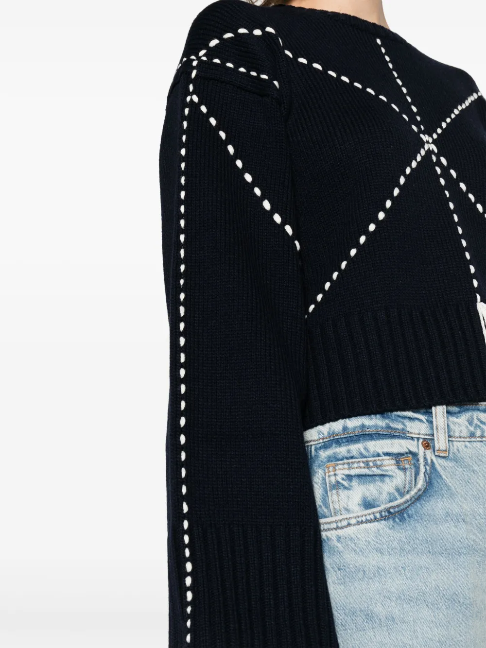 Темно-синий, смесовая шерсть, трикотажный материал, контрастная строчка, вышитый логотип сзади, декоративные кисточки, круглый вырез, приспущенные плечи и длинные широкие рукава.