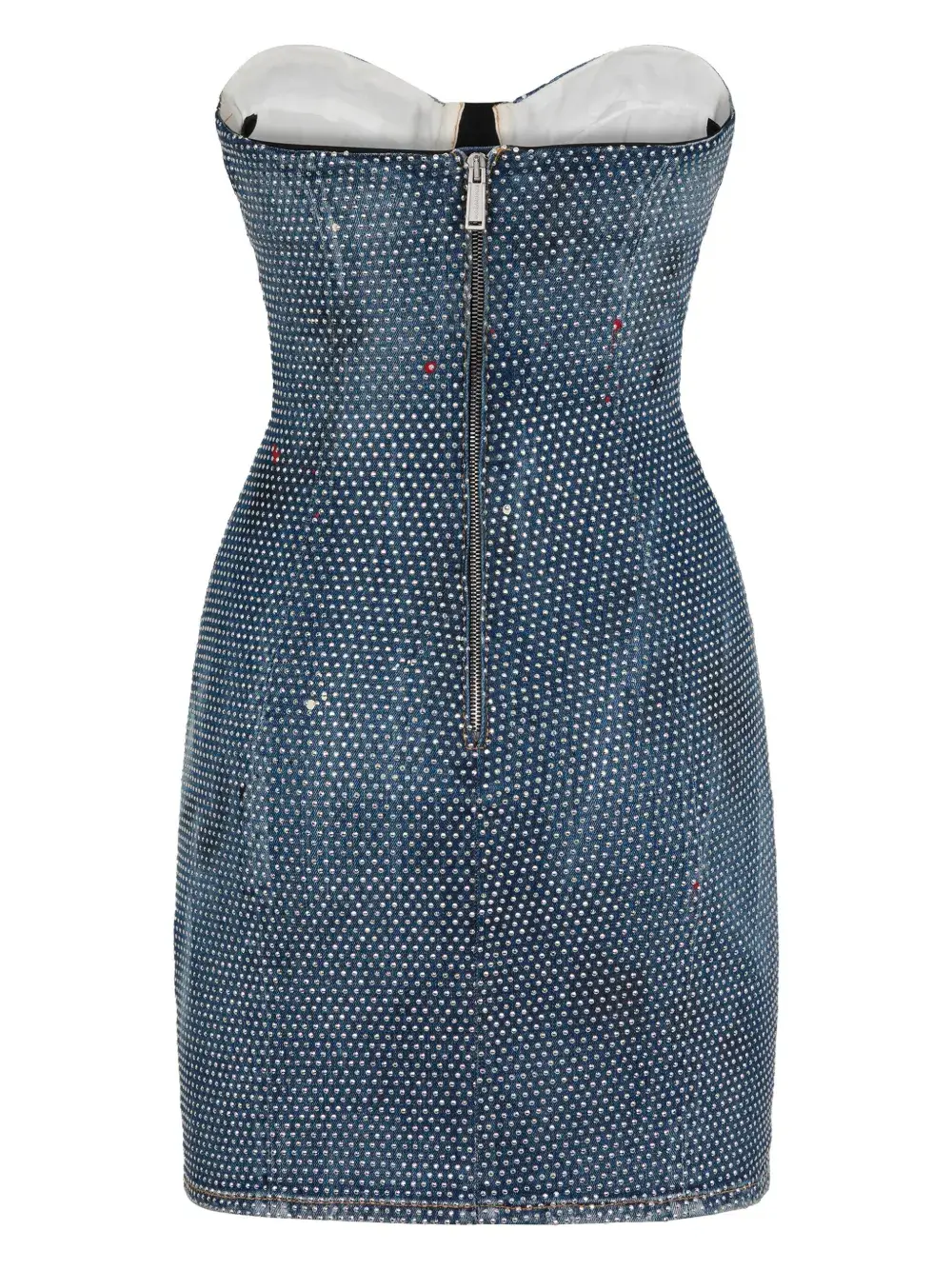 Индиго, эластичный хлопок, деним, темный оттенок денима, эффект потертости, эффект разбрызганной краски, серебристые заклепки, маленькая подвеска с логотипом, лиф в стиле бюстье, вшитые косточки, без бретелей, бирка с логотипом, застежка на молнии сзади, прямой подол, длина до бедер и частичная подкладка.