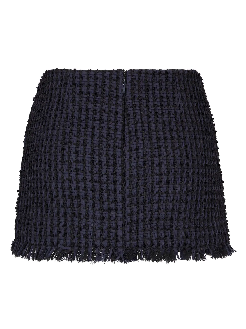 Темно-синий, твидовая ткань, разрез спереди, застежка на молнии сзади, необработанные края и длина до бедер.