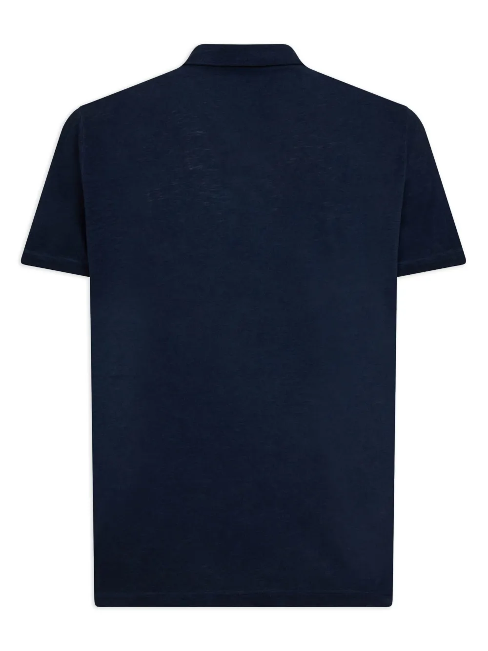 Темно-синий, смесовый хлопок, эффект меланж, принт с логотипом на груди, воротник поло, короткая застежка на пуговицах спереди и короткие рукава.