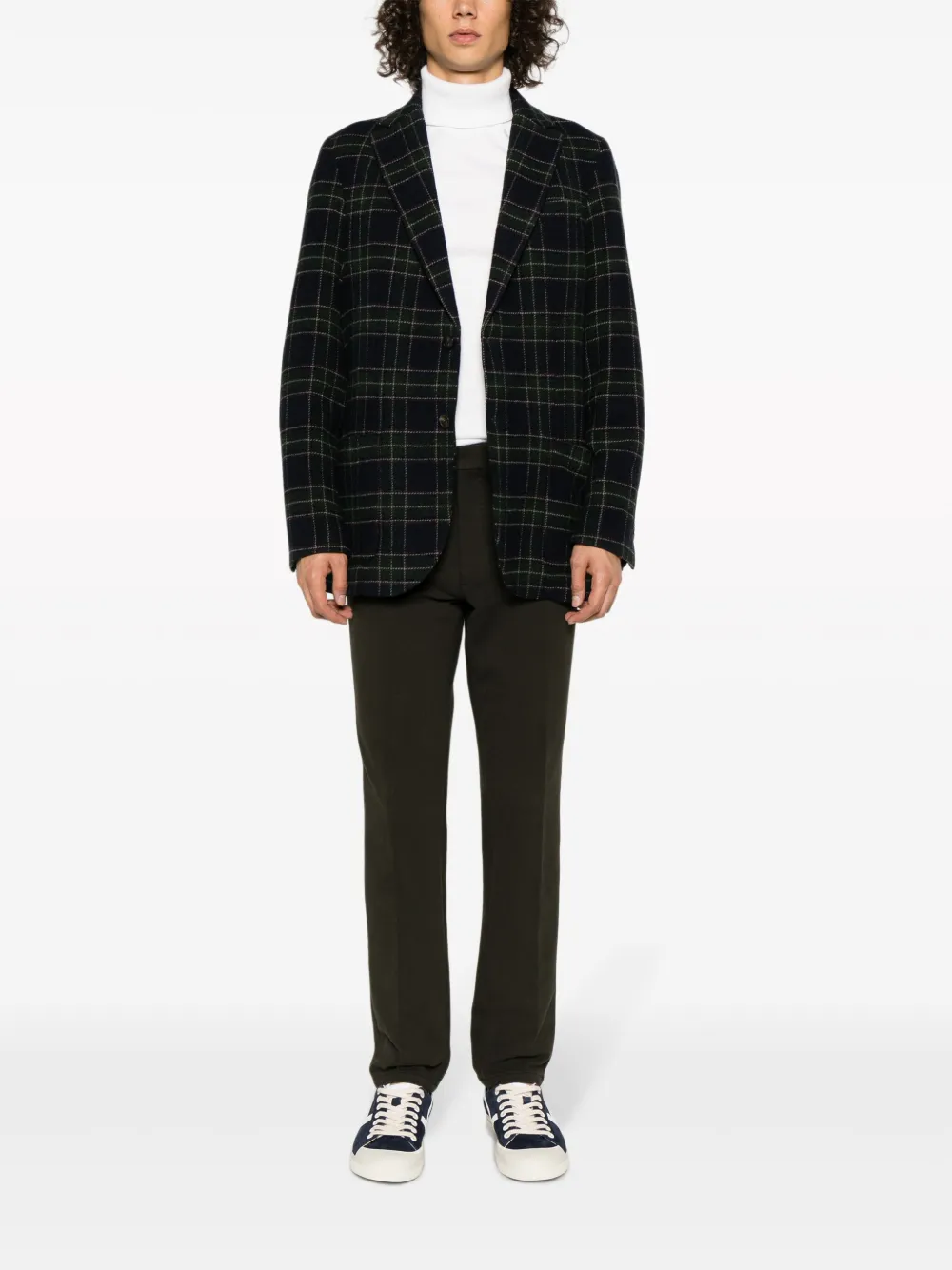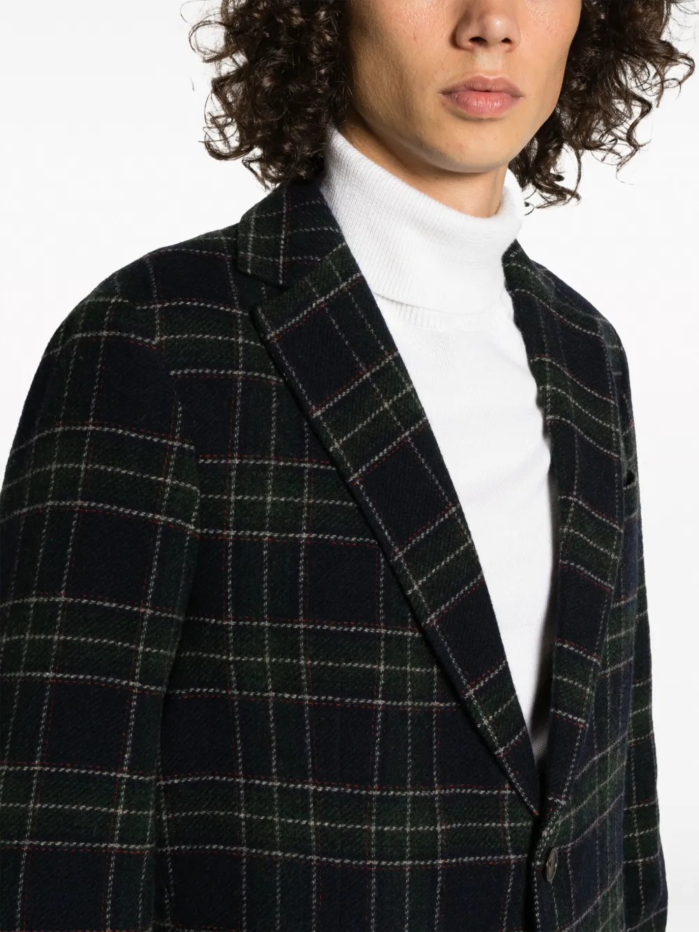 Темно-синий, смесь шерсти и кашемира, клетчатый узор, зазубренные лацканы, застежка на пуговицах спереди, длинные рукава, манжеты на пуговицах и два накладных кармана по бокам.