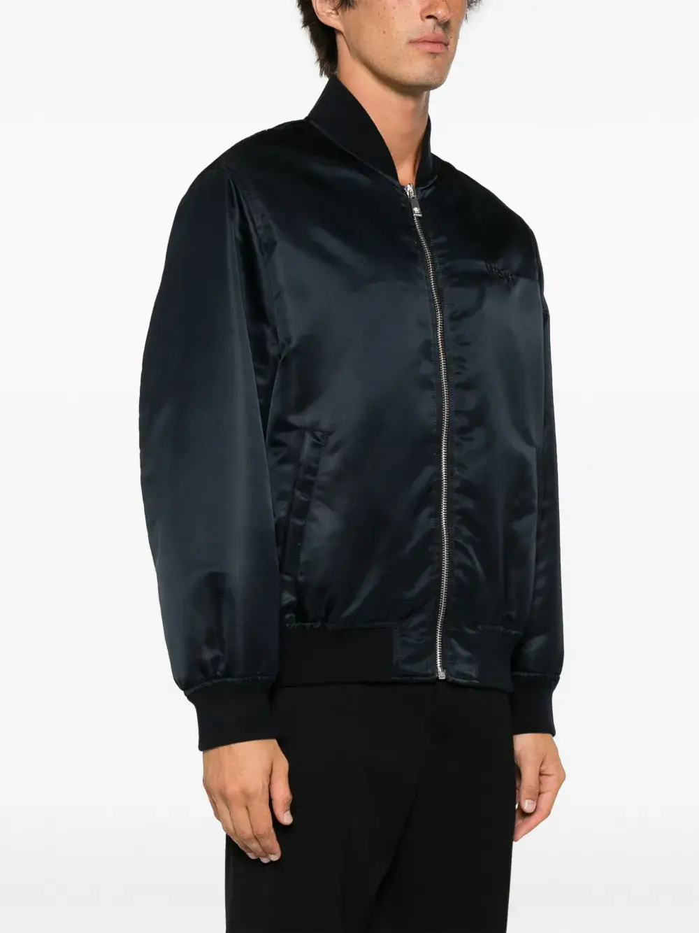 Хлопок, сатиновая фактура, вышитый логотип на груди, принт с логотипом сзади, графичный принт на спине, воротник-стойка, застежка на молнии спереди, длинные рукава и два прорезных кармана по бокам.