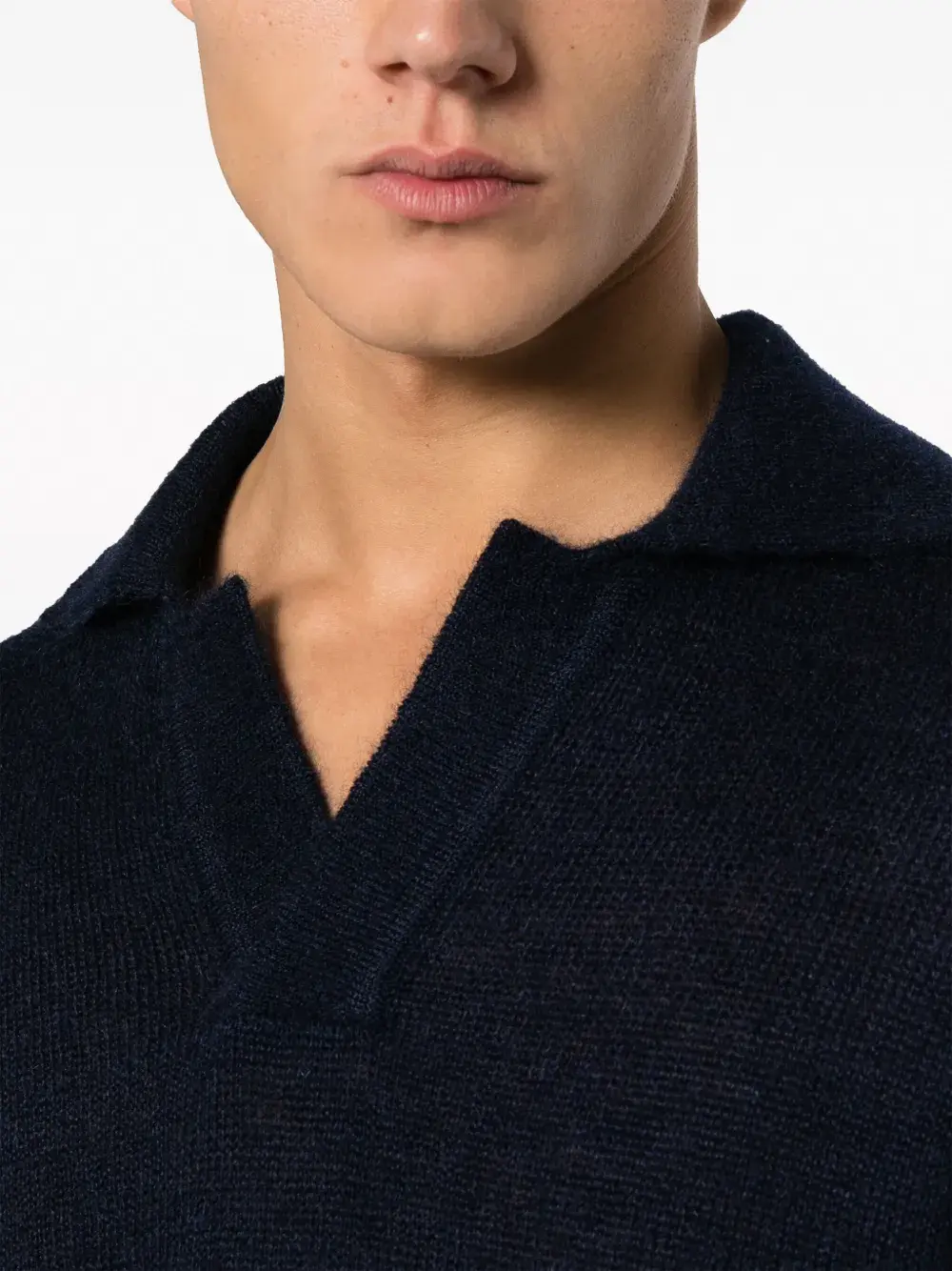 Темно-синий, смесовый мохер, фактурная отделка, воротник поло, V-образный вырез, длинные рукава и прямой подол.
