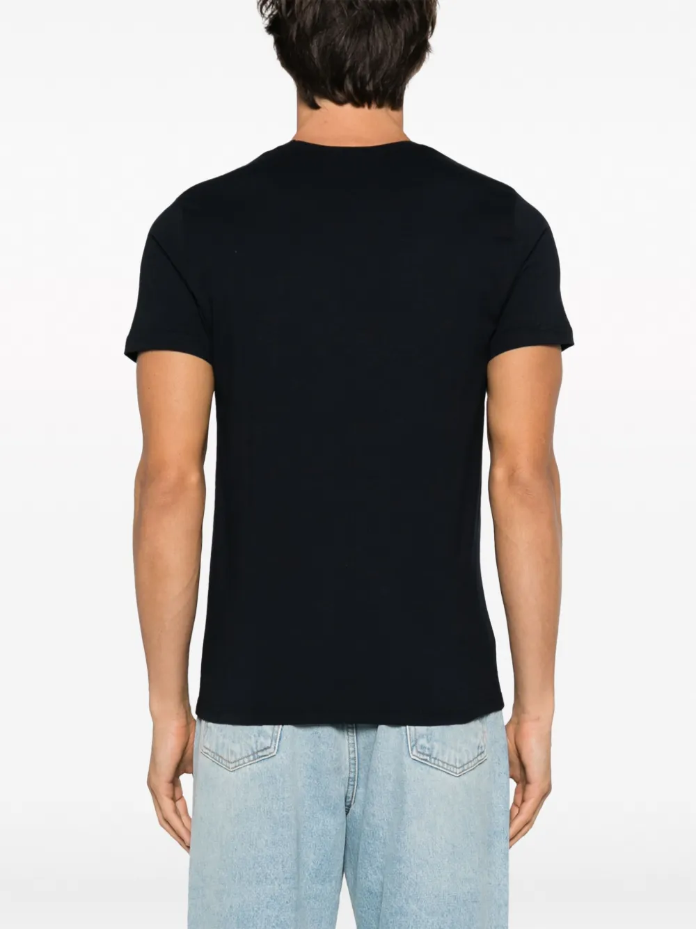 Темно-синий, хлопок, круглый вырез, короткие рукава, прямой подол и вышитый логотип на груди.