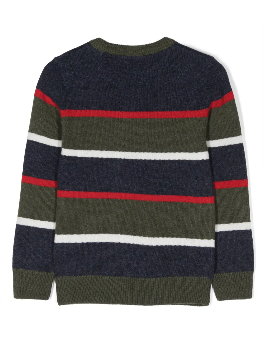 Темно-синий, разноцветный, трикотажный материал, узор в горизонтальную полоску, вышитый логотип на груди, круглый вырез и длинные рукава.