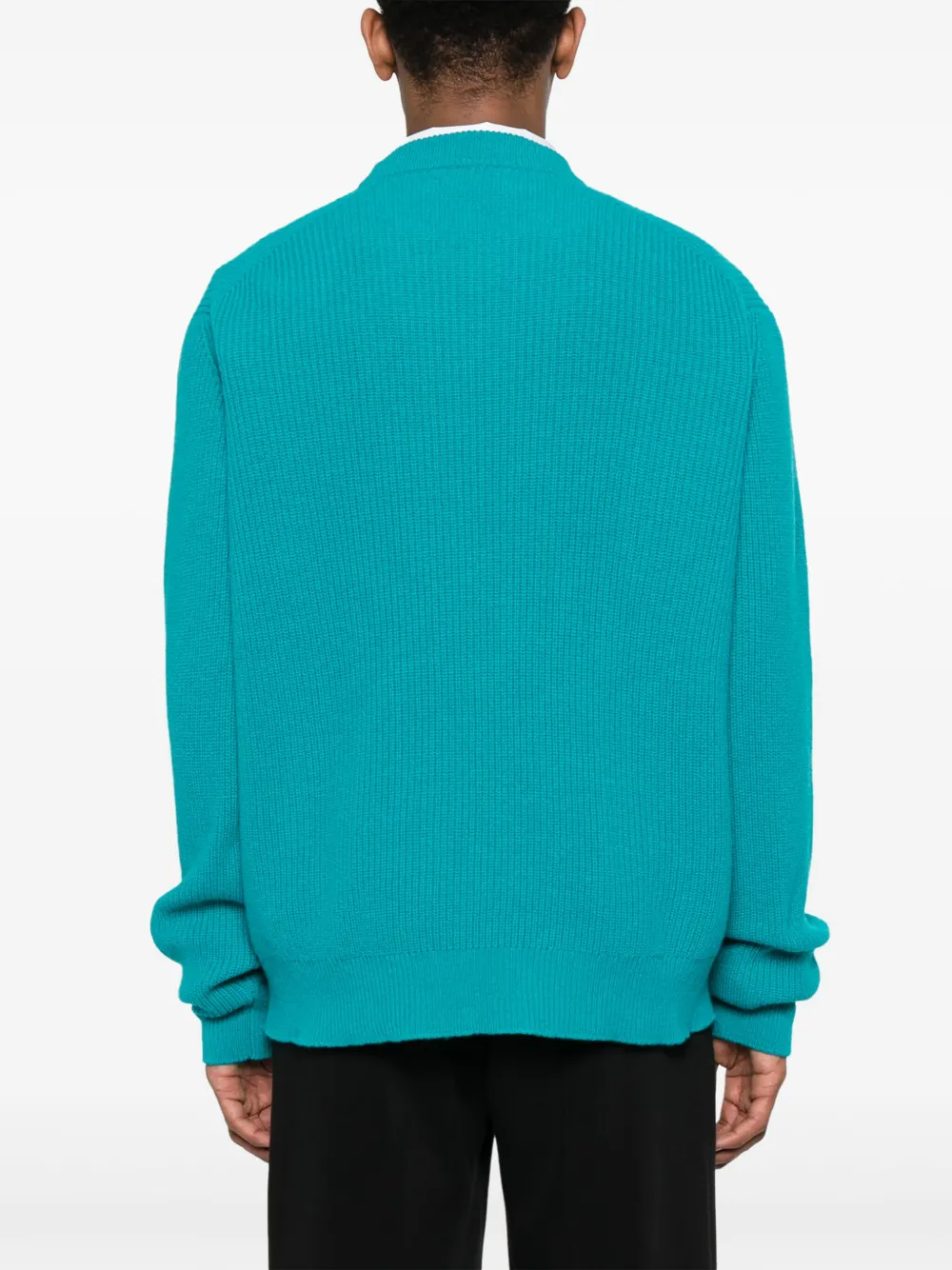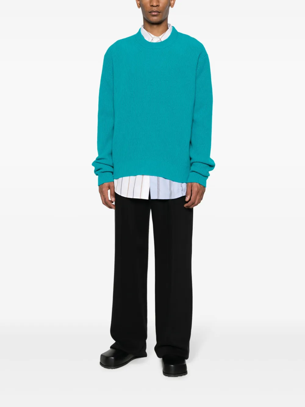 Бирюзовый, смесь шерсти и кашемира, трикотаж в рубчик, круглый вырез и длинные рукава.