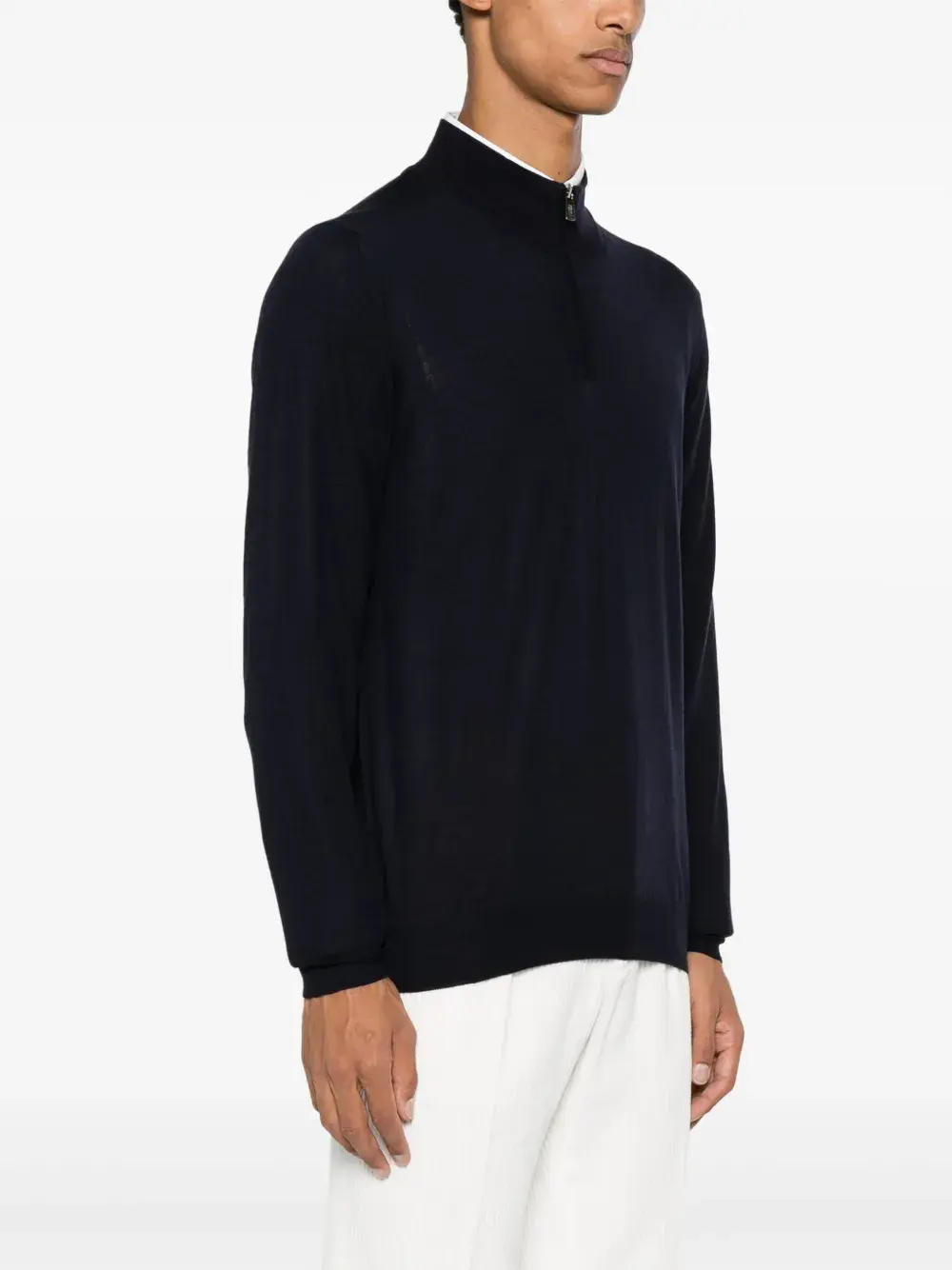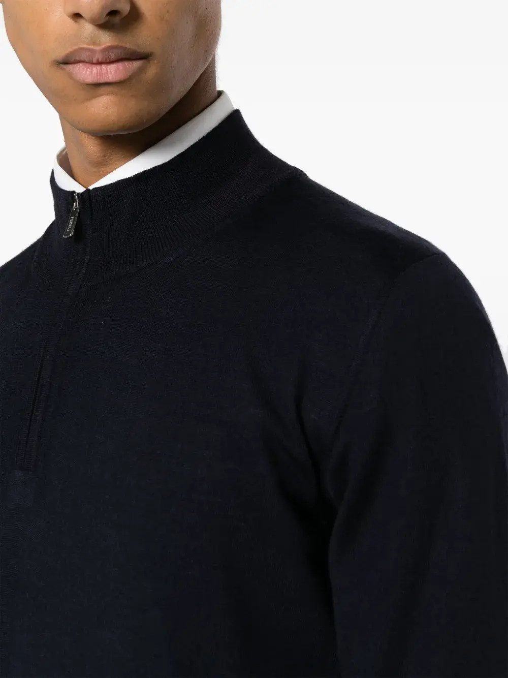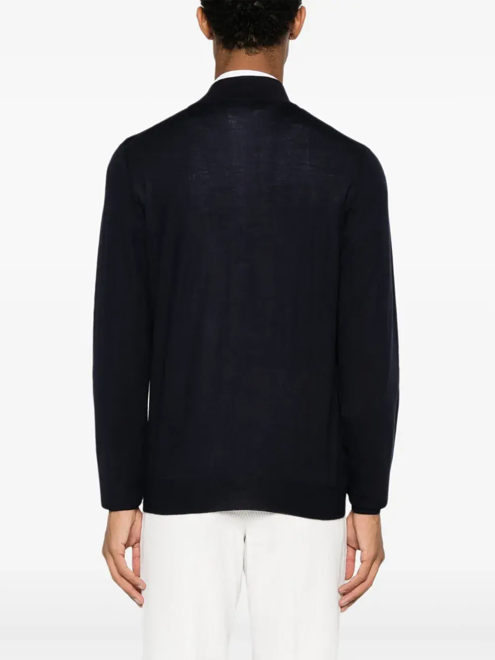 Темно-синий, необработанная шерсть, тонкая вязка, воротник-стойка, застежка на молнии спереди и длинные рукава.