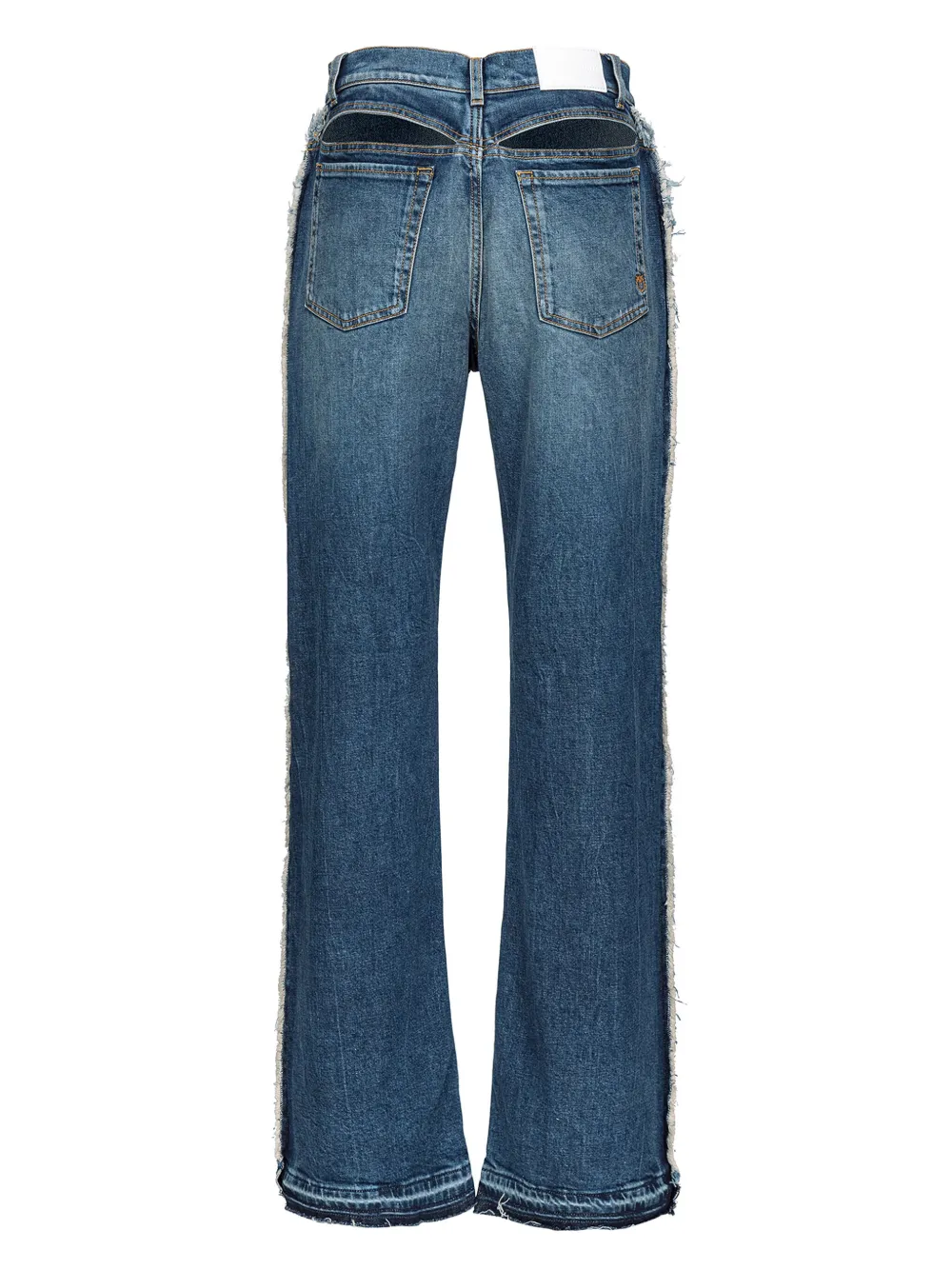 Эффект потертости, нашивка с логотипом сзади, вышитый логотип сзади, вырезные детали, необработанные детали, застежка на молнии и пуговице спереди, пять карманов и необработанный подол.
