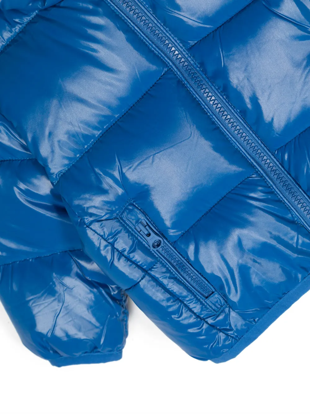 Синий, дутый материал, стеганая модель, нашивка с логотипом на рукаве, классический капюшон, застежка на молнии спереди, длинные рукава, два кармана на молнии и прямой подол.