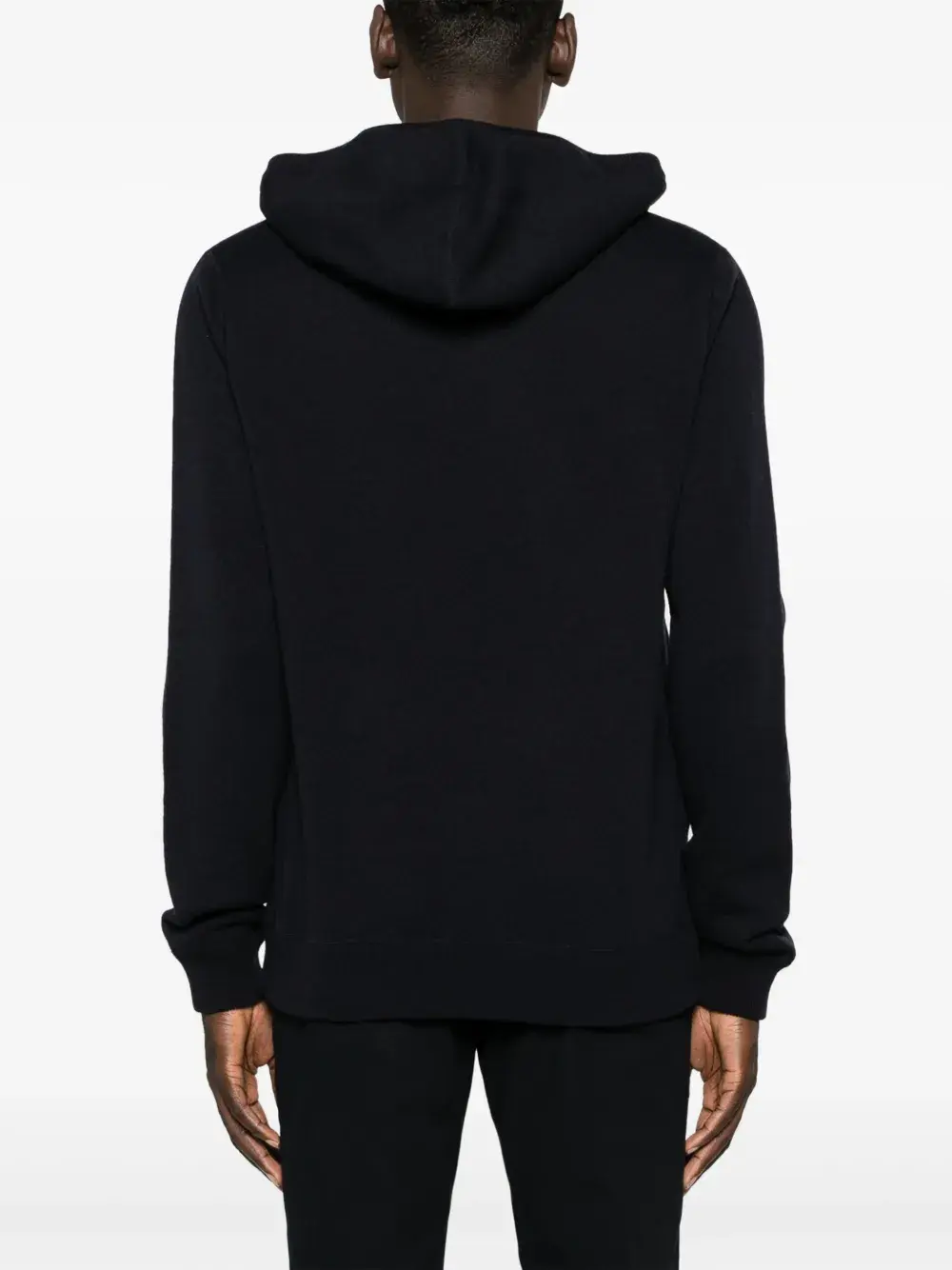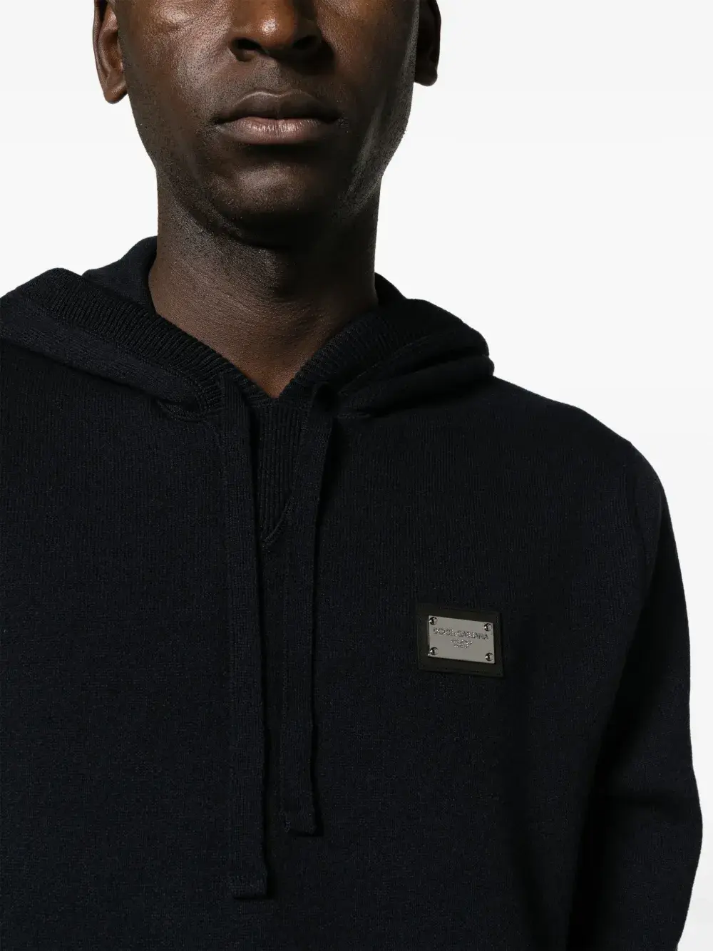 Черный, смесь шерсти и кашемира, серебристый металлический логотип, длинные рукава, затягивающийся на шнурок капюшон, карман-муфта и прямой подол.