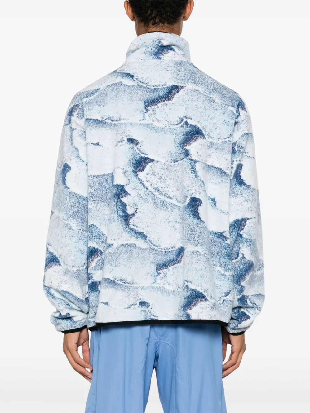 Расцветка Ocean Blue, голубой, смесовый хлопок, махровый эффект, абстрактный принт, контрастная отделка, воротник-труба, застежка на молнии спереди, длинные рукава, два вшитых кармана по бокам и закругленный подол.