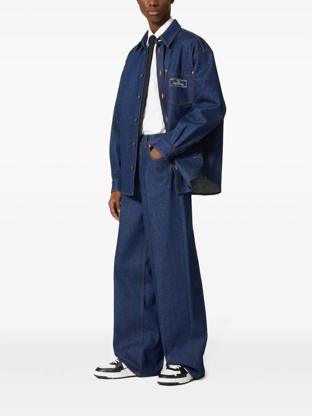 Индиго, хлопок, деним, нашивка с логотипом на груди, контрастная строчка, плоский заостренный воротник, планка на пуговицах спереди, приспущенные плечи, длинные рукава, манжеты на пуговицах и закругленный подол. Коллекция Valentino Ready To Wear. Образ включает аксессуары Valentino Garavani.