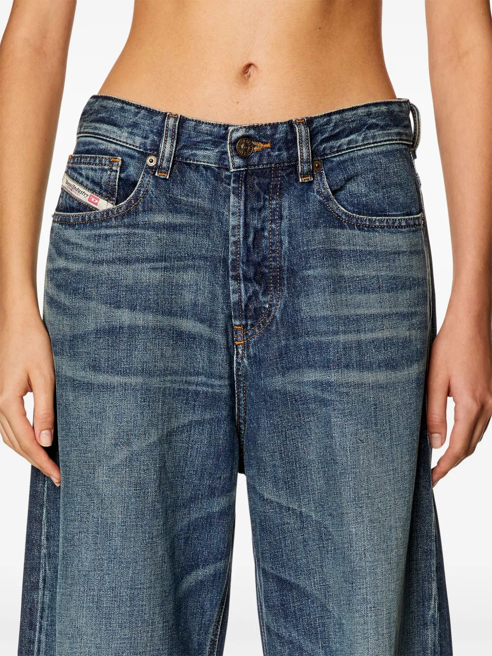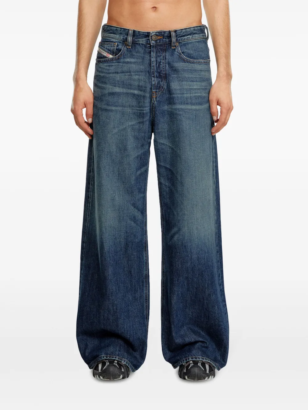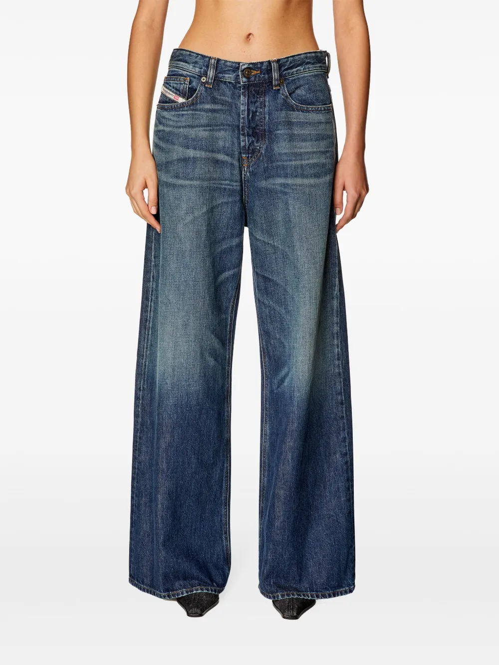 Подробнее о товаре: • темно-синий • хлопок • обработанный деним • декоративные складки • нашивка с логотипом сбоку • нашивка с логотипом сзади • низкая посадка • петли для ремня • свободный крой • потайная застежка на молнии и пуговицах • классическая пятикарманная модель • прямой подол • Это унисекс-модель. Обратите внимание, что для нее используется мужская размерная сетка.