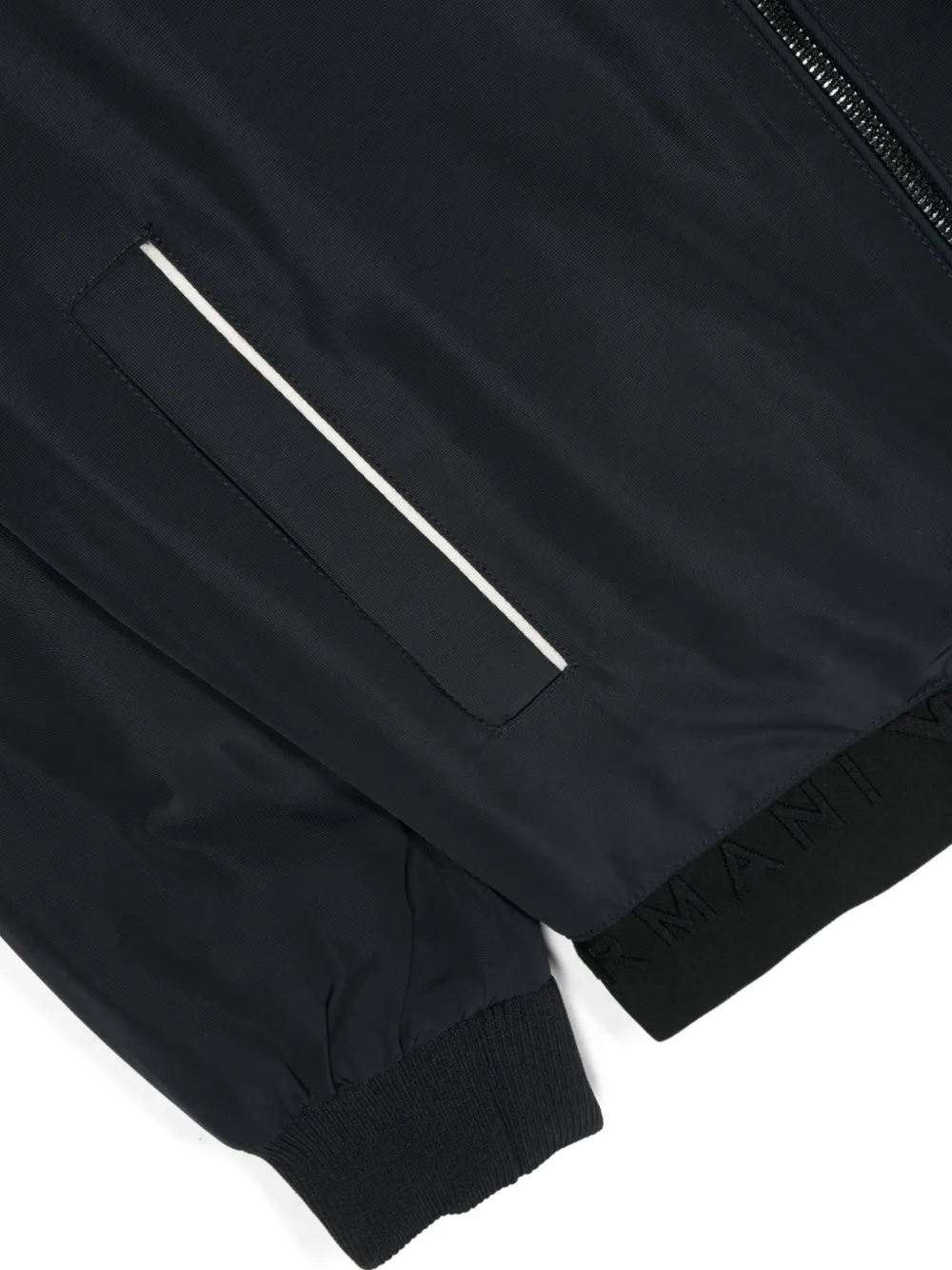 Темно-синий, эластичный пояс с логотипом, бейсбольный воротник, длинные рукава, два вшитых кармана по бокам, застежка на молнии спереди и прямой подол.