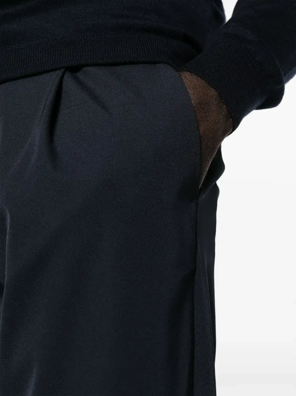 Темно-синий, эластичный материал, серебристый металлический логотип, петли для ремня, кулиска на талии, застежка на пуговицах спереди, два прорезных кармана по бокам, два прорезных кармана сзади и зауженный крой.