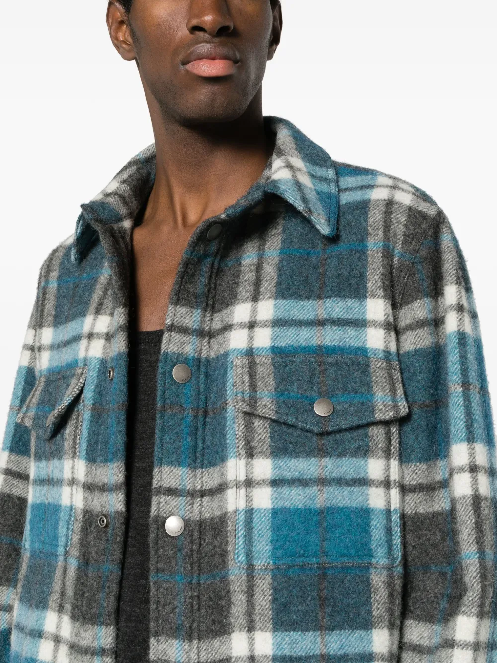 Сине-зеленый, антрацитово-серый, белый, смесовая необработанная шерсть, клетчатый узор, классический воротник, застежка на пуговицах спереди, длинные рукава, манжеты на пуговицах, два нагрудных кармана с клапанами и прямой подол.